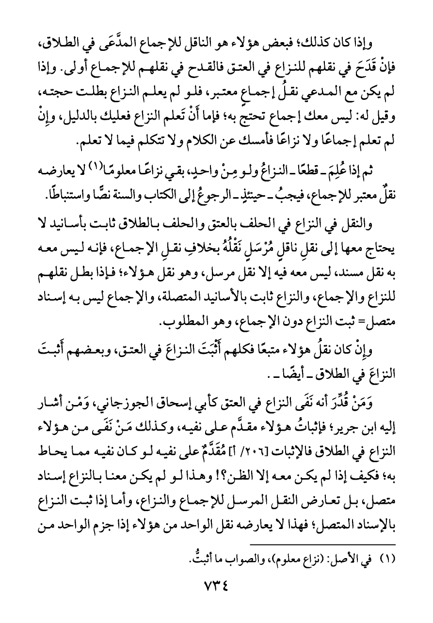 وَمَنْ قُدِّرَ أنه نَفَى النزاع في العتق كأبي إسحاق الجوزجاني، وَمْن أشار إليه ابن جرير؛ فإثباتُ هؤلاء مقدَّم على نفيه، وكذلك مَنْ نَفَى من هؤلاء النزاع في الطلاق فالإثبات [٢٠٦/ أ] مُقَدَّمٌ على نفيه لو كان نفيه مما يحاط به؛ فكيف إذا لم يكن معه إلا الظن؟! وهذا لو لم يكن معنا بالنزاع إسناد متصل، بل تعارض النقل المرسل للإجماع والنزاع، وأما إذا ثبت النزاع بالإسناد المتصل؛ فهذا لا يعارضه نقل الواحد من هؤلاء إذا جزم الواحد من