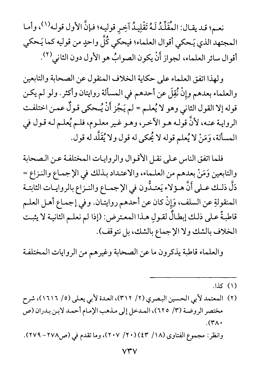 فلما اتفق الناس على نقل الأقوال والروايات المختلفة عن الصحابة والتابعين وَمَنْ بعدهم من العلماء، والاعتداد بذلك في الإجماع والنزاع = دَلَّ ذلك على أَنَّ هؤلاء يَعتدُّون في الإجماع والنزاع بالروايات الثابتة المنقولةِ عن السلف، وَإِنْ كان عن أحدهم روايتان. وفي إجماع أهل العلم قاطبةً على ذلك إبطالٌ لقولِ هذا المعترض: (إذا لم نعلم الثانية لا يثبت الخلاف بالشك ولا الإجماع بالشك، بل نتوقف).