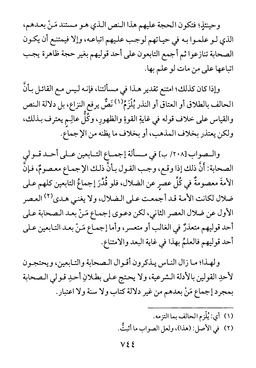 والصواب [٢٠٨/ ب] في مسألة إجماع التابعين على أحد قولي الصحابة: أَنَّ ذلك إذا وقع، وجب القول بأنَّ ذلك الإجماع معصومٌ، فإنَّ الأمةَ معصومةٌ في كُلِّ عصرٍ عن الضلال، فلو قُدِّرَ إجماعُ التابعين كلهم على ضلال لكانت الأمة قد أجمعت على الضلال، ولا يغني هدى (¬٢) العصر الأول عن ضلال العصر الثاني، لكن دعوى إجماع مَنْ بعد الصحابة على أحد قوليهم متعذرٌ في الغالب أو متعسر، وأما إجماع مَنْ بعد التابعين على أحد قوليهم فالعلمُ بهذا في غاية البعد والامتناع.