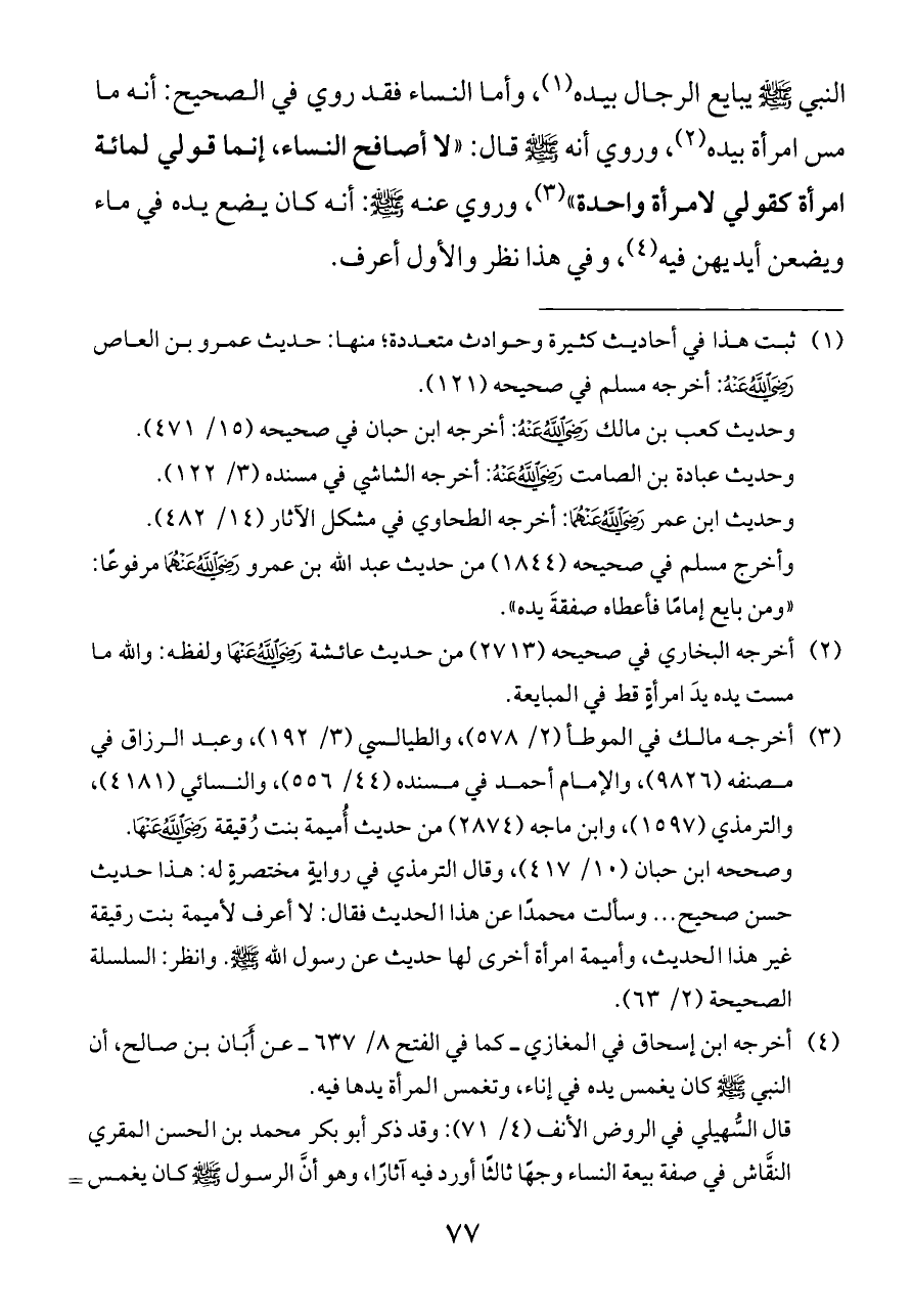(¬٣) أخرجه مالك في الموطأ (٢/ ٥٧٨)، والطيالسي (٣/ ١٩٢)، وعبد الرزاق في مصنفه (٩٨٢٦)، والإمام أحمد في مسنده (٤٤/ ٥٥٦)، والنسائي (٤١٨١)، والترمذي (١٥٩٧)، وابن ماجه (٢٨٧٤) من حديث أُميمة بنت رُقيقة - رضي الله عنها -.