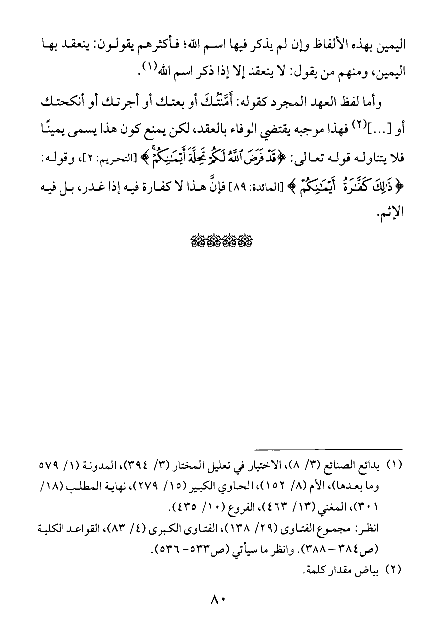 اليمين بهذه الألفاظ وإن لم يذكر فيها اسم الله؛ فأكثرهم يقولون: ينعقد بها اليمين، ومنهم من يقول: لا ينعقد إلا إذا ذكر اسم الله (¬١).