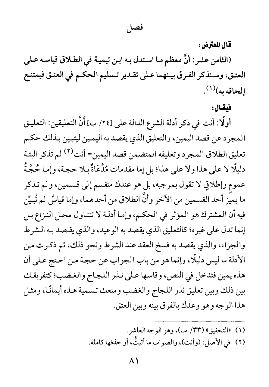 (الثامن عشر: أنَّ معظم ما استدل به ابن تيمية في الطلاق قياسه على العتق، وسنذكر الفرق بينهما على تقدير تسليم الحكم في العتق فيمتنع إلحاقه به) (¬١).