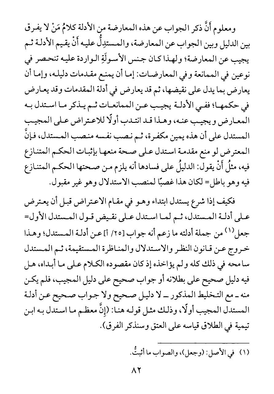 فكيف إذا شرع يستدل ابتداء وهو في مقام الاعتراض قبل أن يعترض على أدلة المستدل، ثم لما استدل على نقيض قول المستدل الأول= جعل (¬١) من جملة أدلته ما زعم أنه جواب [٢٥/ أ] عن أدلة المستدل؛ وهذا خروج عن قانون النظر والاستدلال والمناظرة المستقيمة، ثم المستدل سامحه في ذلك كله ولم يؤاخذه إذ كان مقصوده الكلام على ما أبداه، هل فيه دليل صحيح على بطلانه أو جواب صحيح على دليل المجيب، فلم يكن منه ــ مع التخليط المذكور ــ لا دليل صحيح ولا جواب صحيح عن أدلة المستدل المجيب أولًا، وذلك مثل قوله هنا: (إِنَّ معظم ما استدل به ابن تيمية في الطلاق قياسه على العتق وسنذكر الفرق).