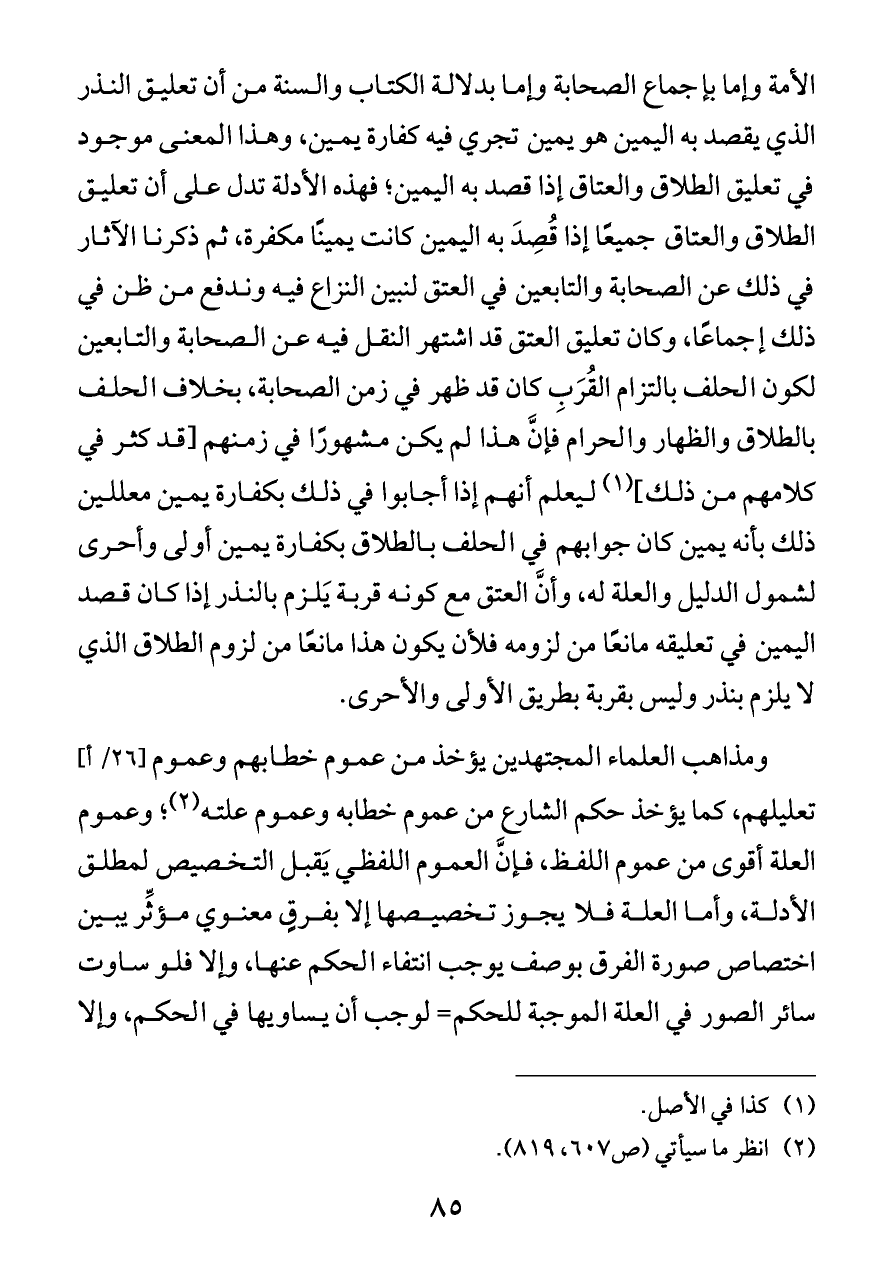 الأمة وإما بإجماع الصحابة وإما بدلالة الكتاب والسنة من أن تعليق النذر الذي يقصد به اليمين هو يمين تجري فيه كفارة يمين، وهذا المعنى موجود في تعليق الطلاق والعتاق إذا قصد به اليمين؛ فهذه الأدلة تدل على أن تعليق الطلاق والعتاق جميعًا إذا قُصِدَ به اليمين كانت يمينًا مكفرة، ثم ذكرنا الآثار في ذلك عن الصحابة والتابعين في العتق لنبين النزاع فيه وندفع من ظن في ذلك إجماعًا، وكان تعليق العتق قد اشتهر النقل فيه عن الصحابة والتابعين لكون الحلف بالتزام القُرَبِ كان قد ظهر في زمن الصحابة، بخلاف الحلف بالطلاق والظهار والحرام فإنَّ هذا لم يكن مشهورًا في زمنهم [قد كثر في كلامهم من ذلك] (¬١) ليعلم أنهم إذا أجابوا في ذلك بكفارة يمين معللين ذلك بأنه يمين كان جوابهم في الحلف بالطلاق بكفارة يمين أولى وأحرى لشمول الدليل والعلة له، وأنَّ العتق مع كونه قربة يَلزم بالنذر إذا كان قصد اليمين في تعليقه مانعًا من لزومه فلأن يكون هذا مانعًا من لزوم الطلاق الذي لا يلزم بنذر وليس بقربة بطريق الأولى والأحرى.