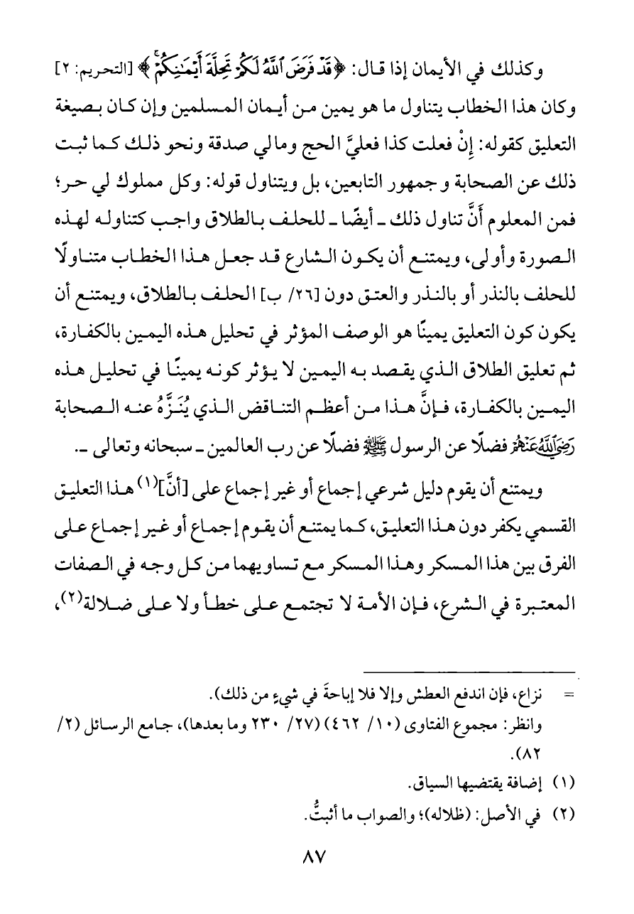 وكذلك في الأيمان إذا قال: {قَدْ فَرَضَ اللَّهُ لَكُمْ تَحِلَّةَ أَيْمَانِكُمْ} [التحريم: ٢] وكان هذا الخطاب يتناول ما هو يمين من أيمان المسلمين وإن كان بصيغة التعليق كقوله: إِنْ فعلت كذا فعليَّ الحج ومالي صدقة ونحو ذلك كما ثبت ذلك عن الصحابة وجمهور التابعين، بل ويتناول قوله: وكل مملوك لي حر؛ فمن المعلوم أَنَّ تناول ذلك ــ أيضًا ــ للحلف بالطلاق واجب كتناوله لهذه الصورة وأولى، ويمتنع أن يكون الشارع قد جعل هذا الخطاب متناولًا للحلف بالنذر أو بالنذر والعتق دون [٢٦/ ب] الحلف بالطلاق، ويمتنع أن يكون كون التعليق يمينًا هو الوصف المؤثر في تحليل هذه اليمين بالكفارة، ثم تعليق الطلاق الذي يقصد به اليمين لا يؤثر كونه يمينًا في تحليل هذه اليمين بالكفارة، فإنَّ هذا من أعظم التناقض الذي يُنَزَّهُ عنه الصحابة - رضي الله عنهم - فضلًا عن الرسول - صلى الله عليه وسلم - فضلًا عن رب العالمين ــ سبحانه وتعالى ــ.