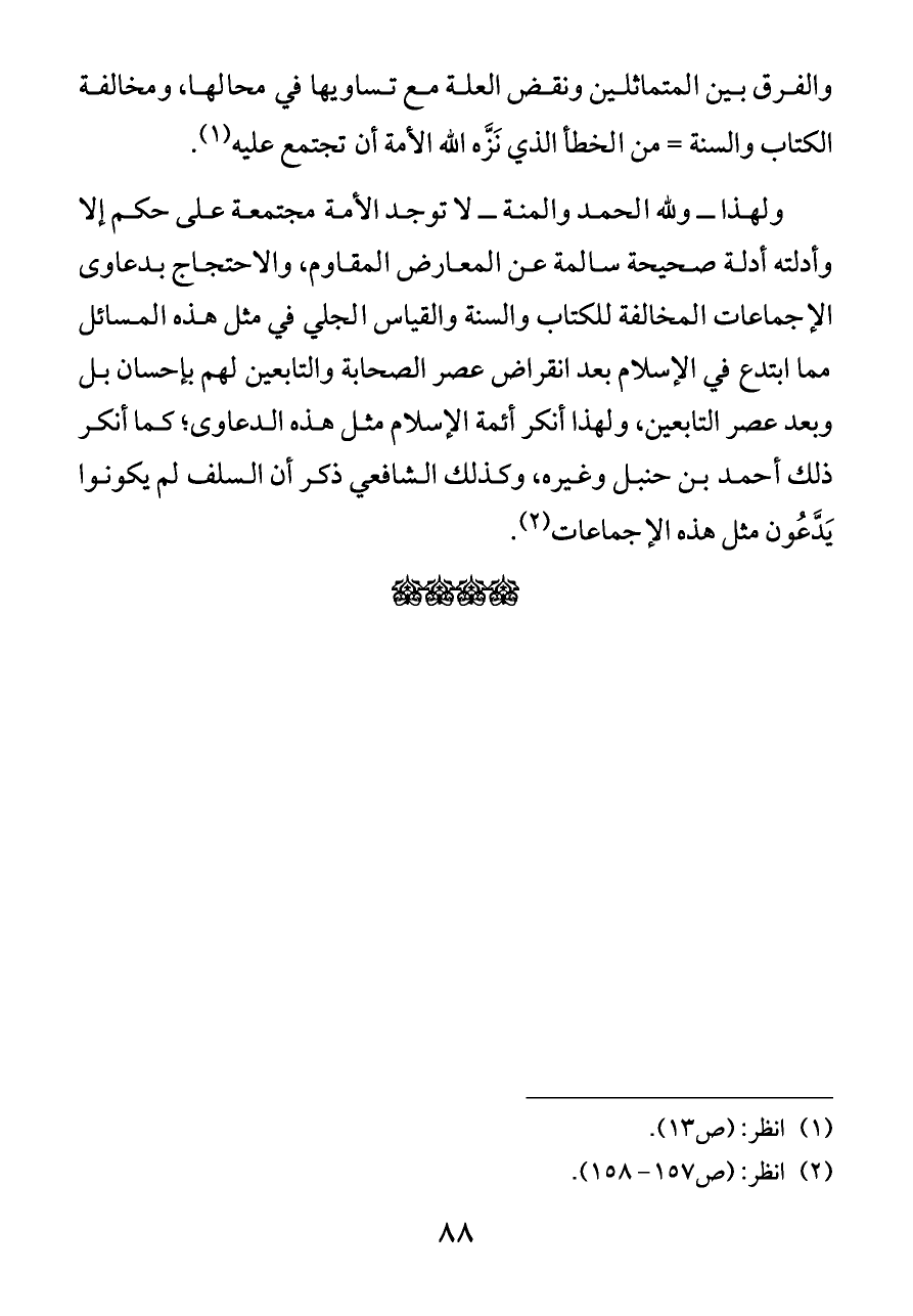 والفرق بين المتماثلين ونقض العلة مع تساويها في محالها, ومخالفة الكتاب والسنة = من الخطأ الذي نَزَّه الله الأمة أن تجتمع عليه (¬١).
