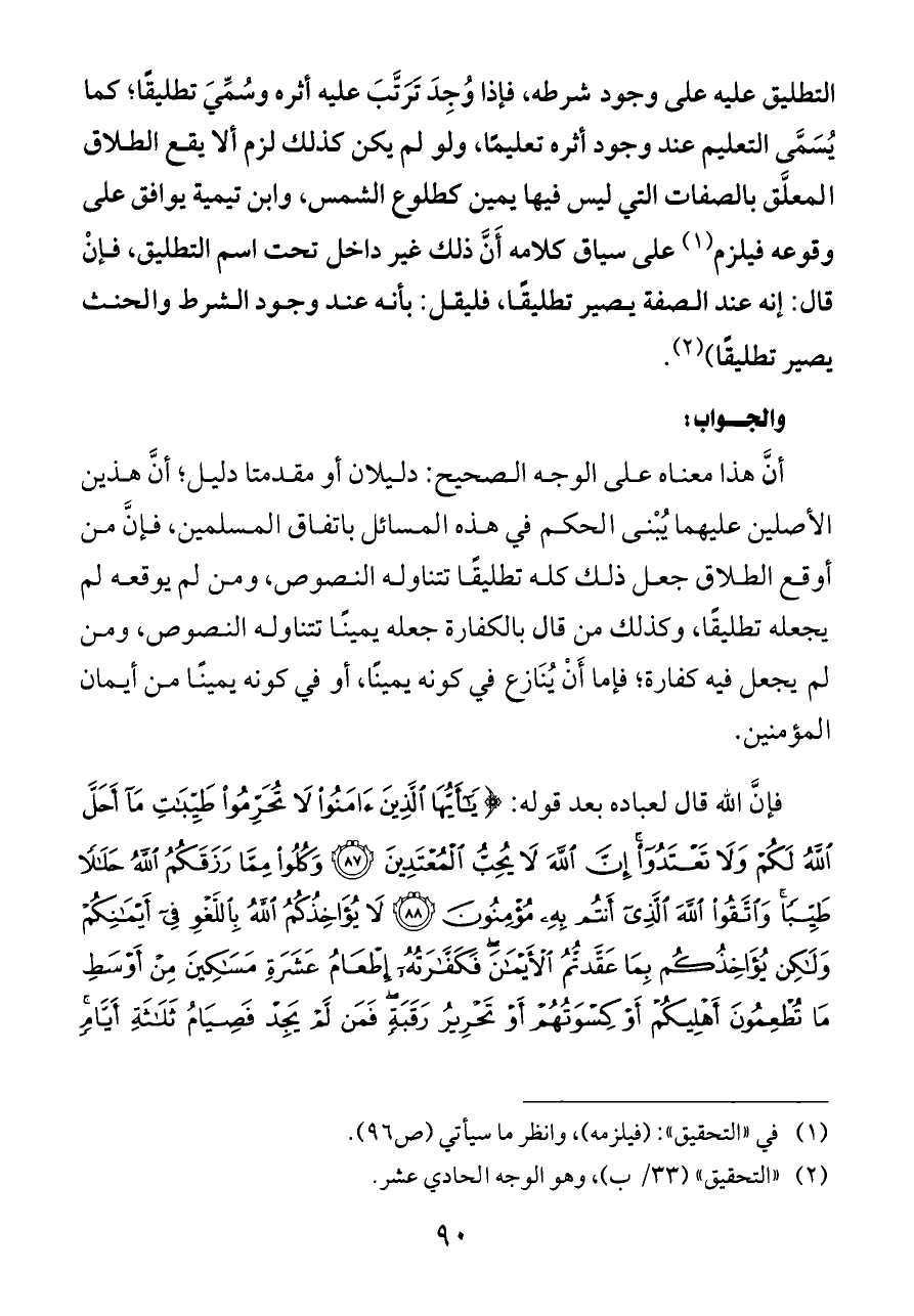أنَّ هذا معناه على الوجه الصحيح: دليلان أو مقدمتا دليل؛ أنَّ هذين الأصلين عليهما يُبْنى الحكم في هذه المسائل باتفاق المسلمين، فإنَّ من أوقع الطلاق جعل ذلك كله تطليقًا تتناوله النصوص، ومن لم يوقعه لم يجعله تطليقًا، وكذلك من قال بالكفارة جعله يمينًا تتناوله النصوص، ومن لم يجعل فيه كفارة؛ فإما أَنْ يُنَازع في كونه يمينًا، أو في كونه يمينًا من أيمان المؤمنين.