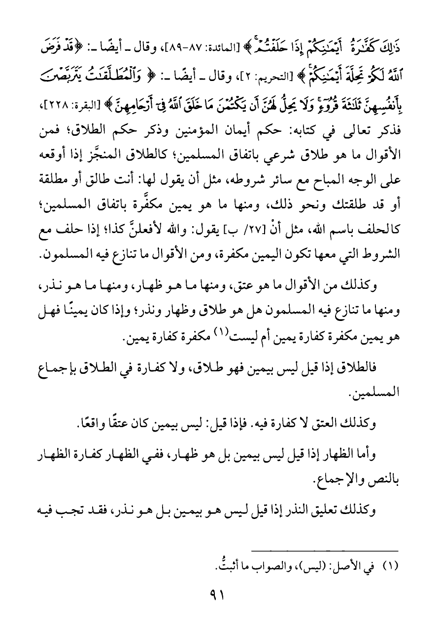 ذَلِكَ كَفَّارَةُ أَيْمَانِكُمْ إِذَا حَلَفْتُمْ} [المائدة: ٨٧ - ٨٩]، وقال ــ أيضًا ــ: {قَدْ فَرَضَ اللَّهُ لَكُمْ تَحِلَّةَ أَيْمَانِكُمْ} [التحريم: ٢]، وقال ــ أيضًا ــ: {وَالْمُطَلَّقَاتُ يَتَرَبَّصْنَ بِأَنْفُسِهِنَّ ثَلَاثَةَ قُرُوءٍ وَلَا يَحِلُّ لَهُنَّ أَنْ يَكْتُمْنَ مَا خَلَقَ اللَّهُ فِي أَرْحَامِهِنَّ} [البقرة: ٢٢٨]، فذكر تعالى في كتابه: حكم أيمان المؤمنين وذكر حكم الطلاق؛ فمن الأقوال ما هو طلاق شرعي باتفاق المسلمين؛ كالطلاق المنجَّز إذا أوقعه على الوجه المباح مع سائر شروطه، مثل أن يقول لها: أنت طالق أو مطلقة أو قد طلقتك ونحو ذلك، ومنها ما هو يمين مكفَّرة باتفاق المسلمين؛ كالحلف باسم الله، مثل أنْ [٢٧/ ب] يقول: والله لأفعلنَّ كذا؛ إذا حلف مع الشروط التي معها تكون اليمين مكفرة، ومن الأقوال ما تنازع فيه المسلمون.