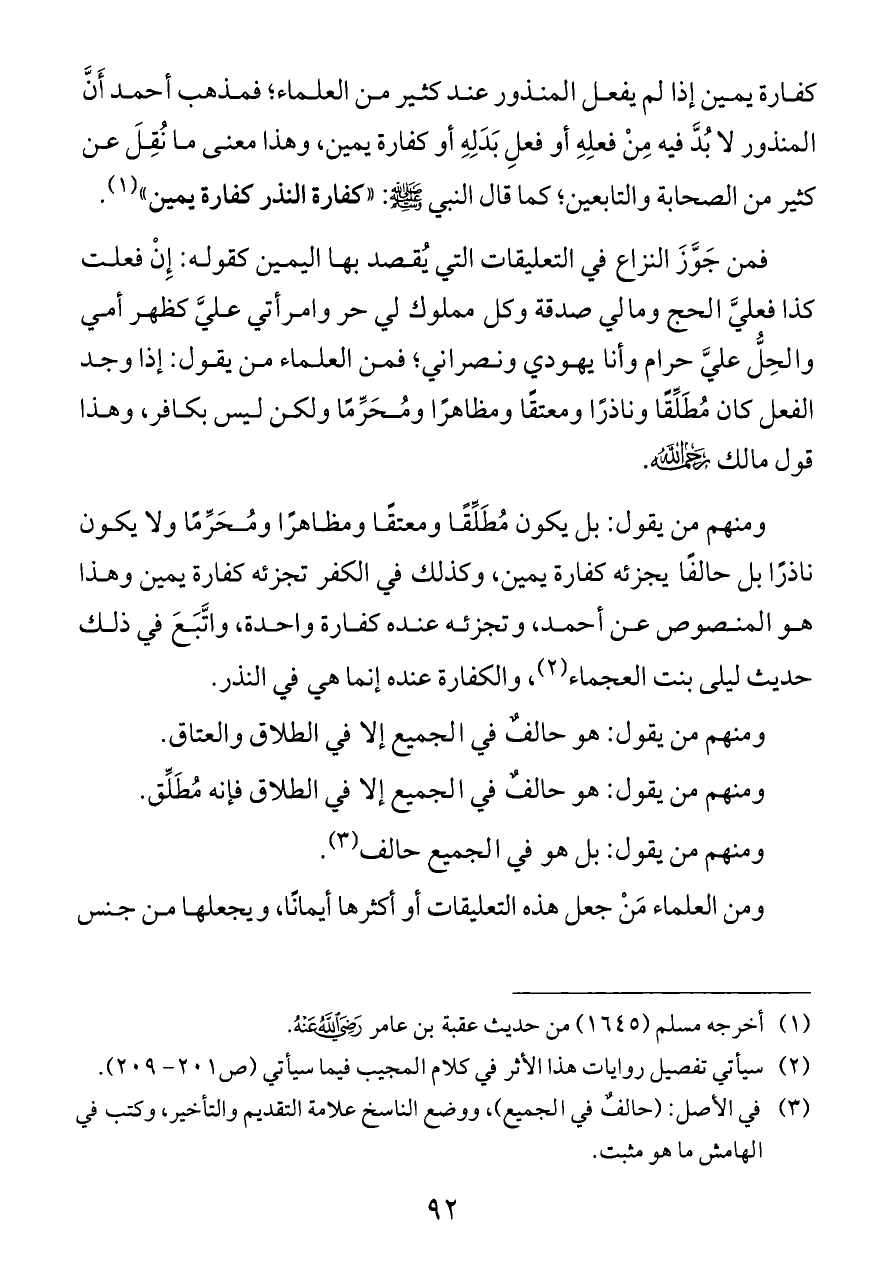 فمن جَوَّزَ النزاع في التعليقات التي يُقصد بها اليمين كقوله: إِنْ فعلت كذا فعليَّ الحج ومالي صدقة وكل مملوك لي حر وامرأتي عليَّ كظهر أمي والحِلُّ عليَّ حرام وأنا يهودي ونصراني؛ فمن العلماء من يقول: إذا وجد الفعل كان مُطَلِّقًا وناذرًا ومعتقًا ومظاهرًا ومُحَرِّمًا ولكن ليس بكافر، وهذا قول مالك - رحمه الله -.