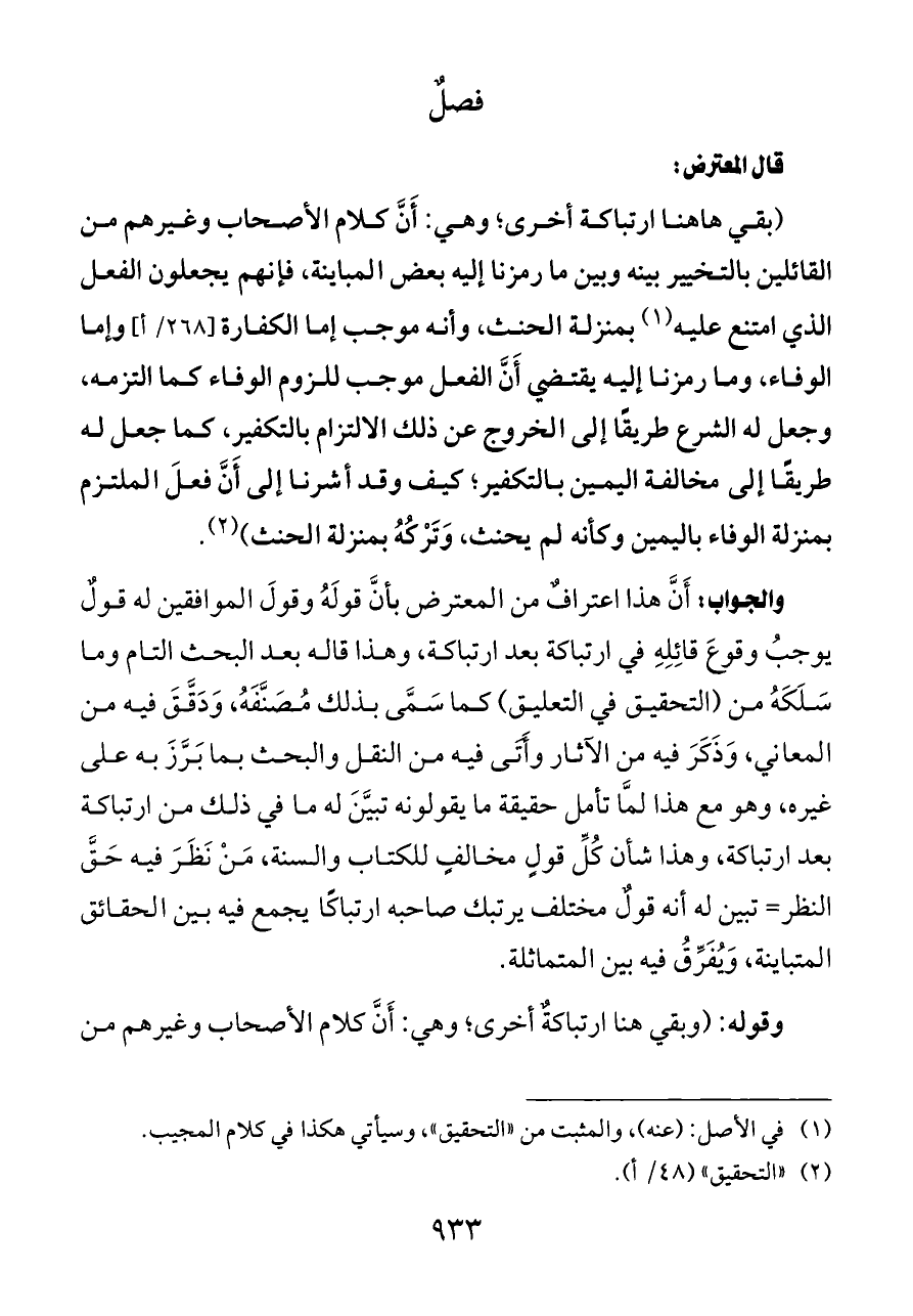 (بقي هاهنا ارتباكة أخرى؛ وهي: أَنَّ كلام الأصحاب وغيرهم من القائلين بالتخيير بينه وبين ما رمزنا إليه بعض المباينة، فإنهم يجعلون الفعل الذي امتنع عليه (¬١) بمنزلة الحنث، وأنه موجب إما الكفارة [٢٦٨/ أ] وإما الوفاء، وما رمزنا إليه يقتضي أَنَّ الفعل موجب للزوم الوفاء كما التزمه، وجعل له الشرع طريقًا إلى الخروج عن ذلك الالتزام بالتكفير، كما جعل له طريقًا إلى مخالفة اليمين بالتكفير؛ كيف وقد أشرنا إلى أَنَّ فعلَ الملتزم بمنزلة الوفاء باليمين وكأنه لم يحنث، وَتَرْكُهُ بمنزلة الحنث) (¬٢).