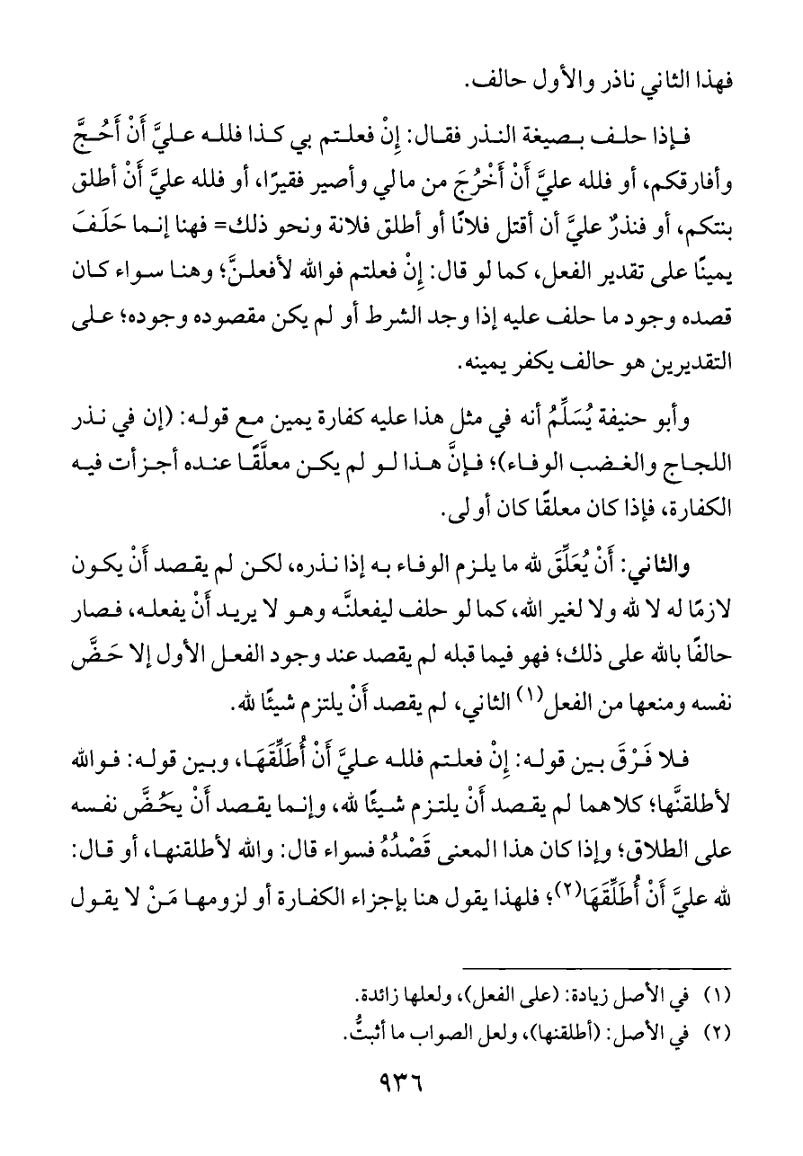 فلا فَرْقَ بين قوله: إِنْ فعلتم فلله عليَّ أَنْ أُطَلِّقَهَا، وبين قوله: فوالله لأطلقنَّها؛ كلاهما لم يقصد أَنْ يلتزم شيئًا لله، وإنما يقصد أَنْ يَحُضَّ نفسه على الطلاق؛ وإذا كان هذا المعنى قَصْدُهُ فسواء قال: والله لأطلقنها، أو قال: لله عليَّ أَنْ أُطَلِّقَهَا (¬٢)؛ فلهذا يقول هنا بإجزاء الكفارة أو لزومها مَنْ لا يقول