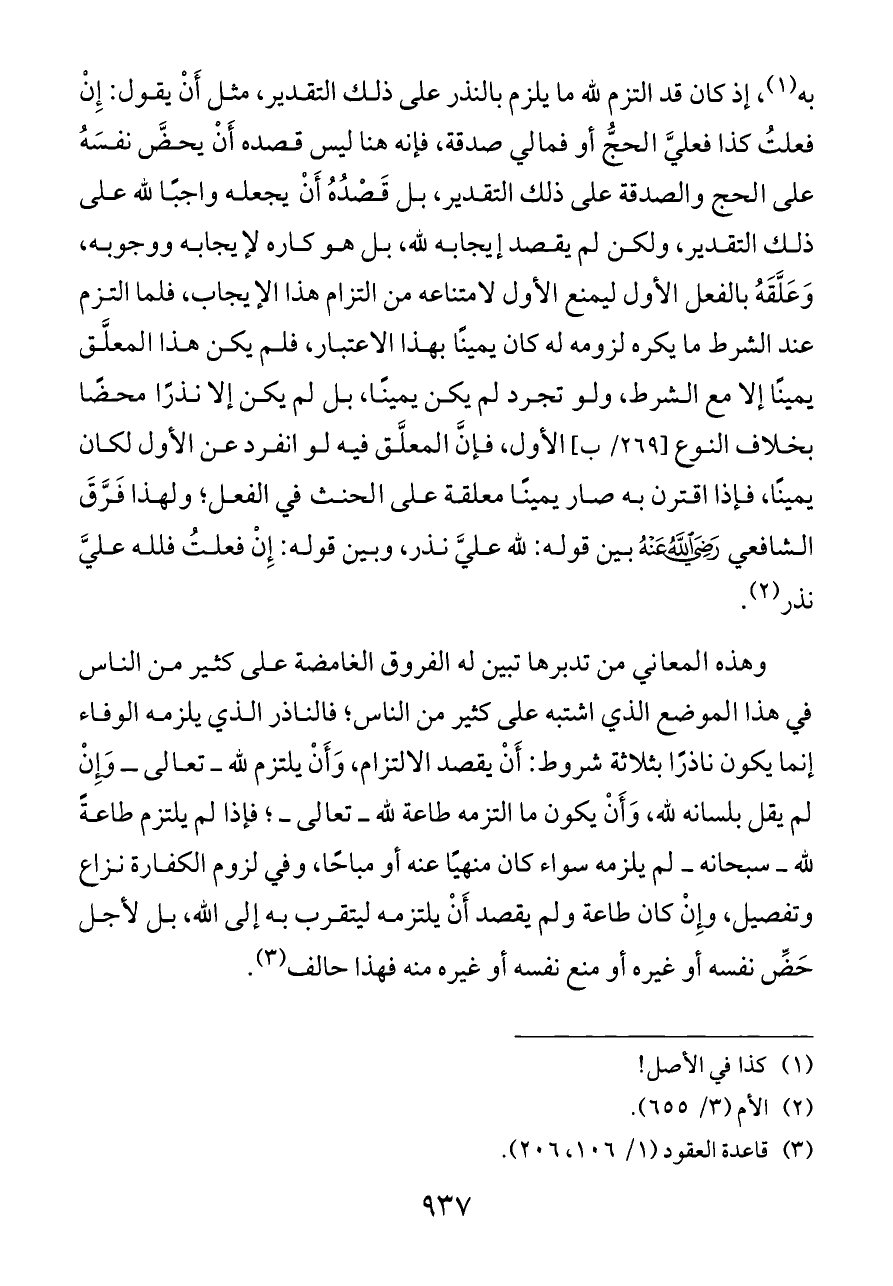 وهذه المعاني من تدبرها تبين له الفروق الغامضة على كثير من الناس في هذا الموضع الذي اشتبه على كثير من الناس؛ فالناذر الذي يلزمه الوفاء إنما يكون ناذرًا بثلاثة شروط: أَنْ يقصد الالتزام، وَأَنْ يلتزم لله ــ تعالى ــ وَإِنْ لم يقل بلسانه لله، وَأَنْ يكون ما التزمه طاعة لله ــ تعالى ــ؛ فإذا لم يلتزم طاعةً لله ــ سبحانه ــ لم يلزمه سواء كان منهيًا عنه أو مباحًا، وفي لزوم الكفارة نزاع وتفصيل، وإِنْ كان طاعة ولم يقصد أَنْ يلتزمه ليتقرب به إلى الله، بل لأجل حَضِّ نفسه أو غيره أو منع نفسه أو غيره منه فهذا حالف (¬٣).