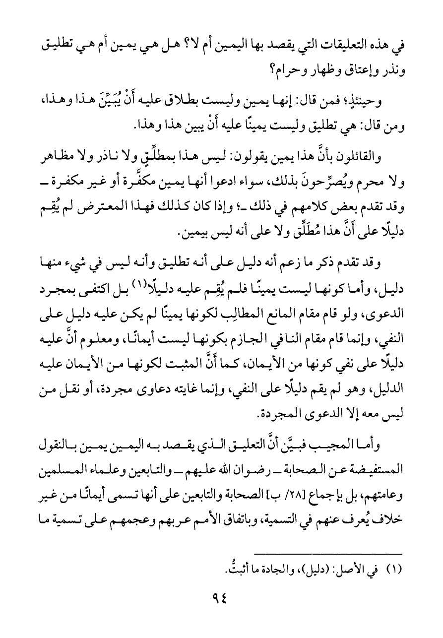 وأما المجيب فبيَّن أنَّ التعليق الذي يقصد به اليمين يمين بالنقول المستفيضة عن الصحابة ــ رضوان الله عليهم ــ والتابعين وعلماء المسلمين وعامتهم، بل بإجماع [٢٨/ ب] الصحابة والتابعين على أنها تسمى أيمانًا من غير خلاف يُعرف عنهم في التسمية، وباتفاق الأمم عربهم وعجمهم على تسمية ما
