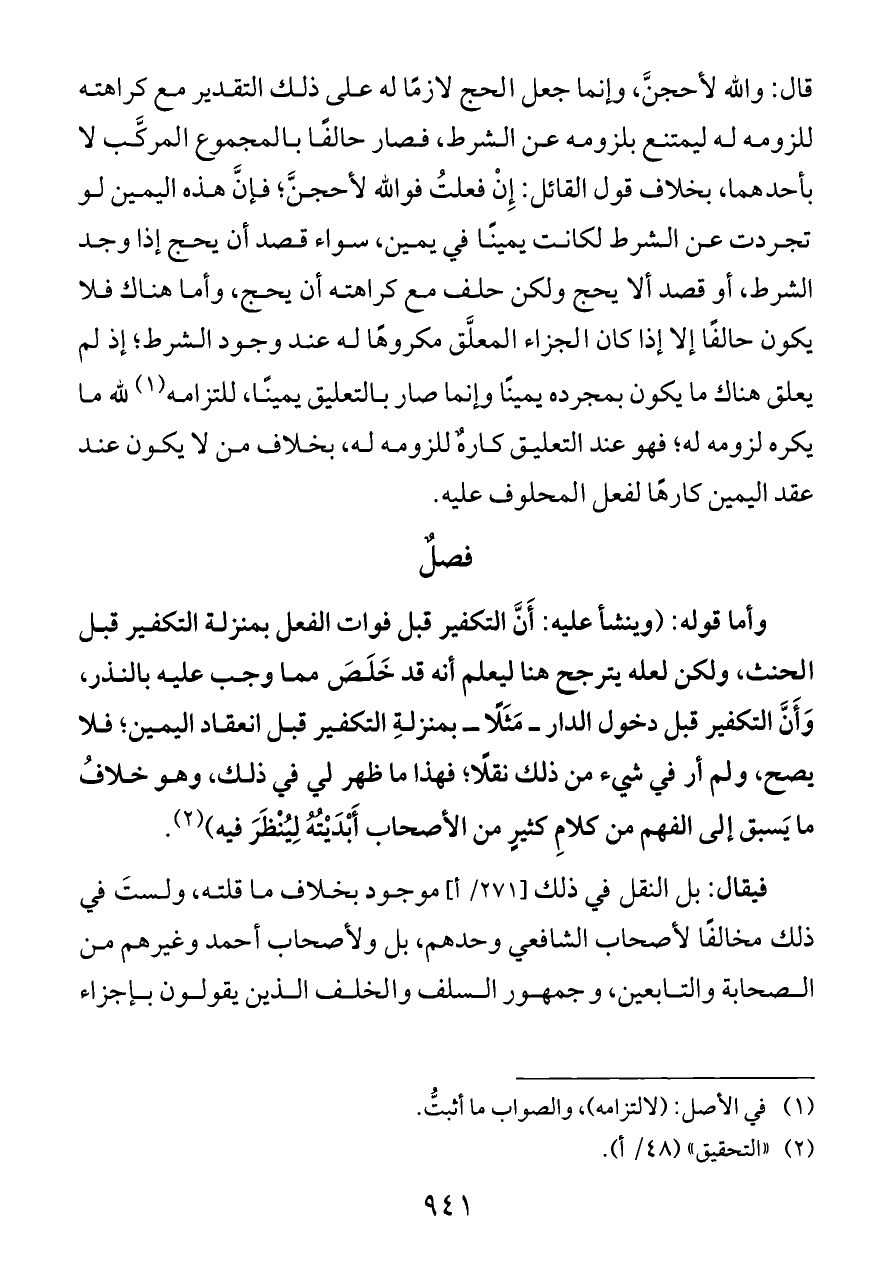 قال: والله لأحجنَّ، وإنما جعل الحج لازمًا له على ذلك التقدير مع كراهته للزومه له ليمتنع بلزومه عن الشرط، فصار حالفًا بالمجموع المركَّب لا بأحدهما، بخلاف قول القائل: إِنْ فعلتُ فوالله لأحجنَّ؛ فإنَّ هذه اليمين لو تجردت عن الشرط لكانت يمينًا في يمين، سواء قصد أن يحج إذا وجد الشرط، أو قصد ألا يحج ولكن حلف مع كراهته أن يحج، وأما هناك فلا يكون حالفًا إلا إذا كان الجزاء المعلَّق مكروهًا له عند وجود الشرط؛ إذ لم يعلق هناك ما يكون بمجرده يمينًا وإنما صار بالتعليق يمينًا، للتزامه (¬١) لله ما يكره لزومه له؛ فهو عند التعليق كارهٌ للزومه له، بخلاف من لا يكون عند عقد اليمين كارهًا لفعل المحلوف عليه.