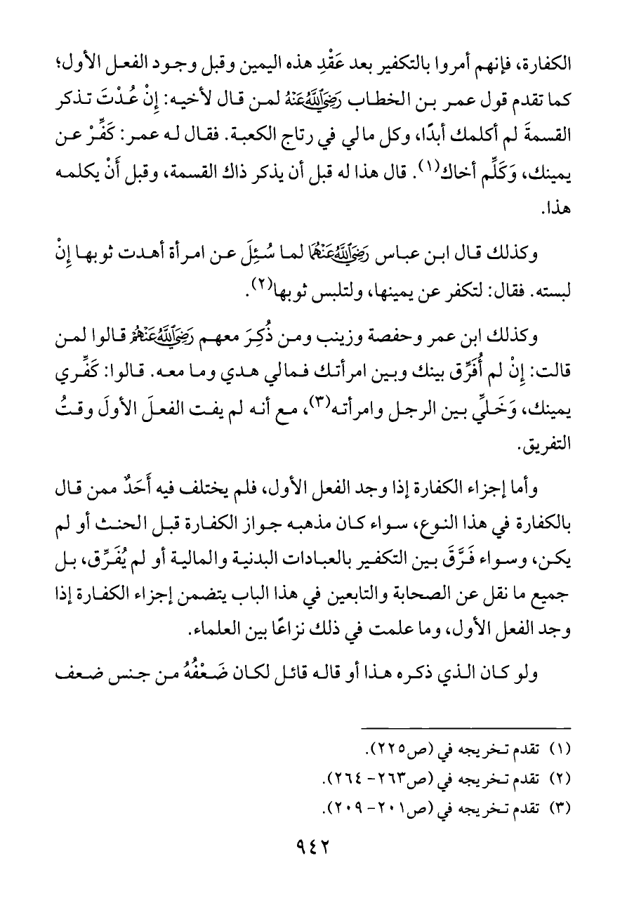 الكفارة، فإنهم أمروا بالتكفير بعد عَقْدِ هذه اليمين وقبل وجود الفعل الأول؛ كما تقدم قول عمر بن الخطاب - رضي الله عنه - لمن قال لأخيه: إِنْ عُدْتَ تذكر القسمةَ لم أكلمك أبدًا، وكل مالي في رتاج الكعبة. فقال له عمر: كَفِّرْ عن يمينك، وَكَلِّم أخاك (¬١). قال هذا له قبل أن يذكر ذاك القسمة، وقبل أَنْ يكلمه هذا.