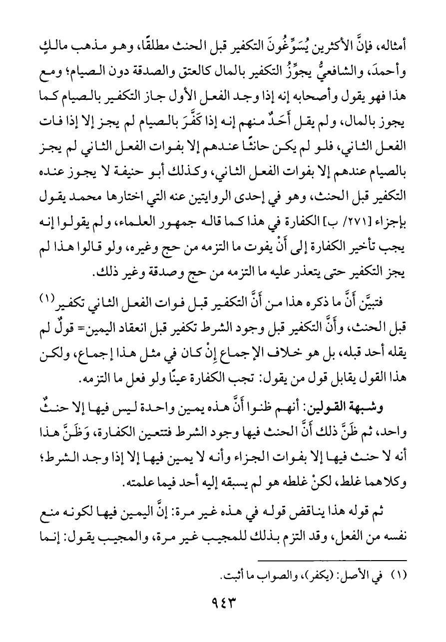 أمثاله، فإنَّ الأكثرين يُسَوِّغُونَ التكفير قبل الحنث مطلقًا، وهو مذهب مالكٍ وأحمدَ، والشافعيُّ يجوِّزُ التكفير بالمال كالعتق والصدقة دون الصيام؛ ومع هذا فهو يقول وأصحابه إنه إذا وجد الفعل الأول جاز التكفير بالصيام كما يجوز بالمال، ولم يقل أَحَدٌ منهم إنه إذا كَفَّرَ بالصيام لم يجز إلا إذا فات الفعل الثاني، فلو لم يكن حانثًا عندهم إلا بفوات الفعل الثاني لم يجز بالصيام عندهم إلا بفوات الفعل الثاني، وكذلك أبو حنيفة لا يجوز عنده التكفير قبل الحنث، وهو في إحدى الروايتين عنه التي اختارها محمد يقول بإجزاء [٢٧١/ ب] الكفارة في هذا كما قاله جمهور العلماء، ولم يقولوا إنه يجب تأخير الكفارة إلى أَنْ يفوت ما التزمه من حج وغيره، ولو قالوا هذا لم يجز التكفير حتى يتعذر عليه ما التزمه من حج وصدقة وغير ذلك.