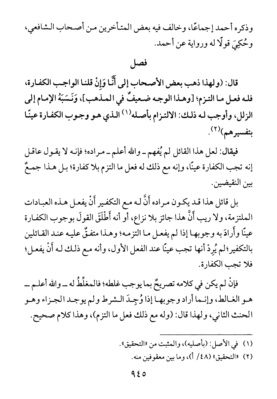 بل قائل هذا قد يكون مراده أَنَّ له مع التكفير أَنْ يفعل هذه العبادات الملتزمة، ولا ريب أَنَّ هذا جائز بلا نزاع، أو أنه أَطْلَقَ القولَ بوجوب الكفارة عينًا وأَرادَ به وجوبها إذا لم يفعل ما التزمه؛ وهذا متفقٌ عليه عند القائلين بالتكفير؛ لم يُرِدْ أنها تجب عينًا عند الفعل الأول، وأنه مع ذلك له أَنْ يفعل؛ فلا تجب الكفارة.