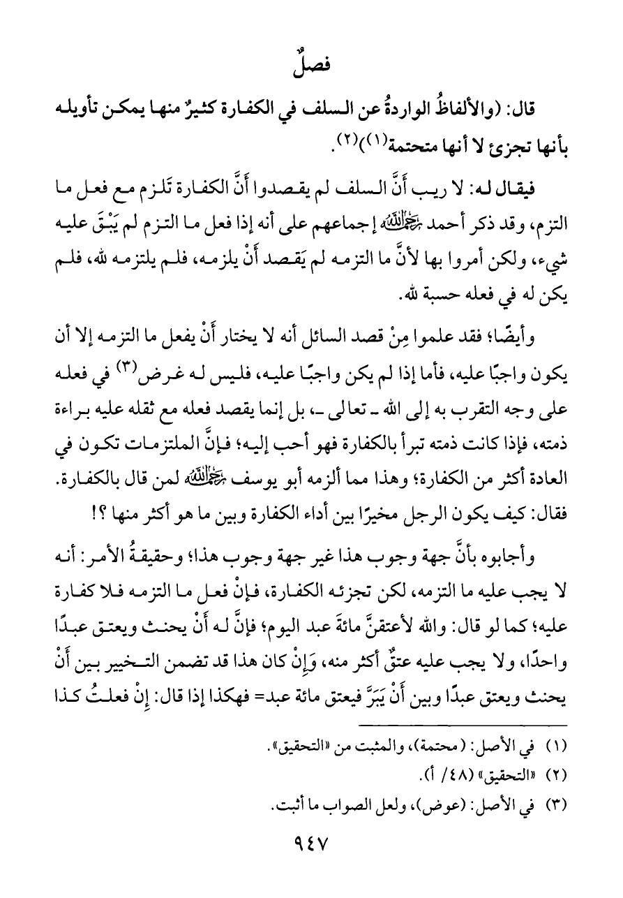 فيقال له: لا ريب أَنَّ السلف لم يقصدوا أَنَّ الكفارة تَلزم مع فعل ما التزم، وقد ذكر أحمد - رحمه الله - إجماعهم على أنه إذا فعل ما التزم لم يَبْقَ عليه شيء، ولكن أمروا بها لأنَّ ما التزمه لم يَقصد أَنْ يلزمه، فلم يلتزمه لله، فلم يكن له في فعله حسبة لله.