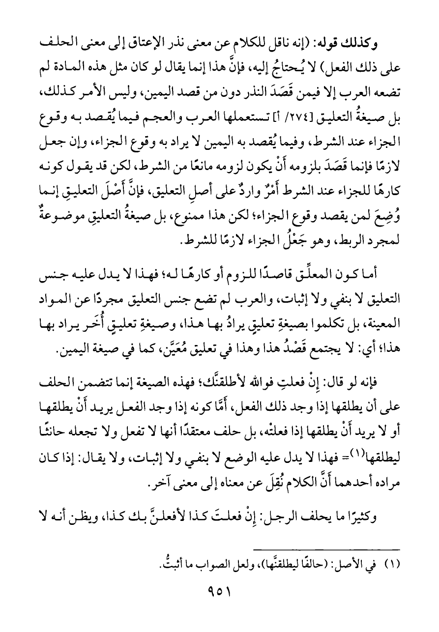 وكذلك قوله: (إنه ناقل للكلام عن معنى نذر الإعتاق إلى معنى الحلف على ذلك الفعل) لا يُحتاجُ إليه، فإنَّ هذا إنما يقال لو كان مثل هذه المادة لم تضعه العرب إلا فيمن قَصَدَ النذر دون من قصد اليمين، وليس الأمر كذلك، بل صيغةُ التعليق [٢٧٤/ أ] تستعملها العرب والعجم فيما يُقصد به وقوع الجزاء عند الشرط، وفيما يُقصد به اليمين لا يراد به وقوع الجزاء، وإن جعل لازمًا فإنما قَصَدَ بلزومه أَنْ يكون لزومه مانعًا من الشرط، لكن قد يقول كونه كارهًا للجزاء عند الشرط أَمْرٌ واردٌ على أصلِ التعليق، فإنَّ أَصْلَ التعليقِ إنما وُضِعَ لمن يقصد وقوع الجزاء؛ لكن هذا ممنوع، بل صيغةُ التعليقِ موضوعةٌ لمجرد الربط، وهو جَعْلُ الجزاء لازمًا للشرط.