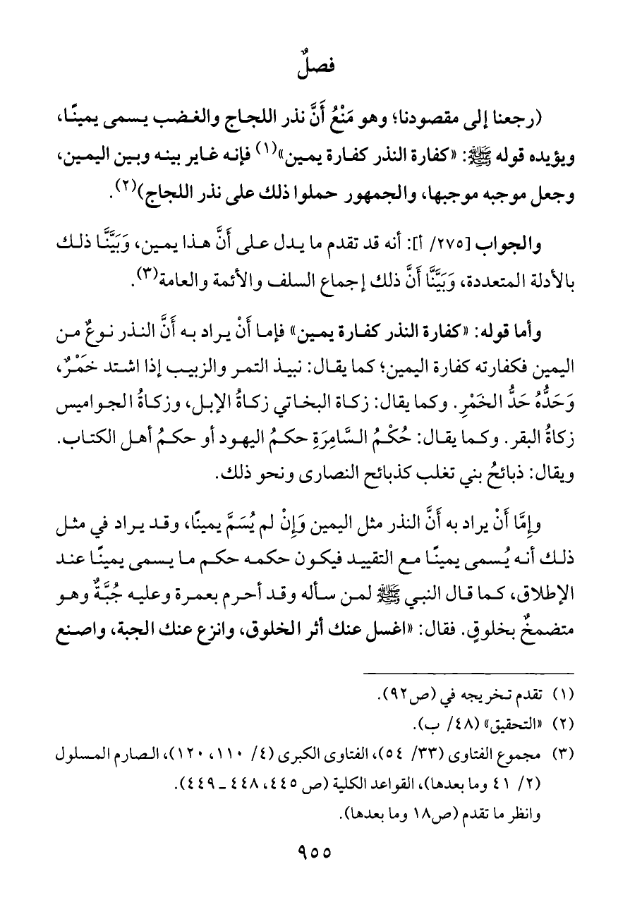 والجواب [٢٧٥/ أ]: أنه قد تقدم ما يدل على أَنَّ هذا يمين، وَبَيَّنَّا ذلك بالأدلة المتعددة، وَبَيَّنَّا أَنَّ ذلك إجماع السلف والأئمة والعامة (¬٣).