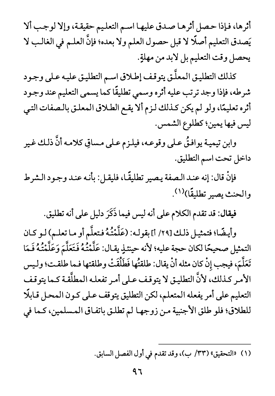 كذلك التطليق المعلَّق يتوقف إطلاق اسم التطليق عليه على وجود شرطه، فإذا وجد ترتب عليه أثره وسمي تطليقًا كما يسمى التعليم عند وجود أثره تعليمًا، ولو لم يكن كذلك لزم ألا يقع الطلاق المعلق بالصفات التي ليس فيها يمين؛ كطلوع الشمس.