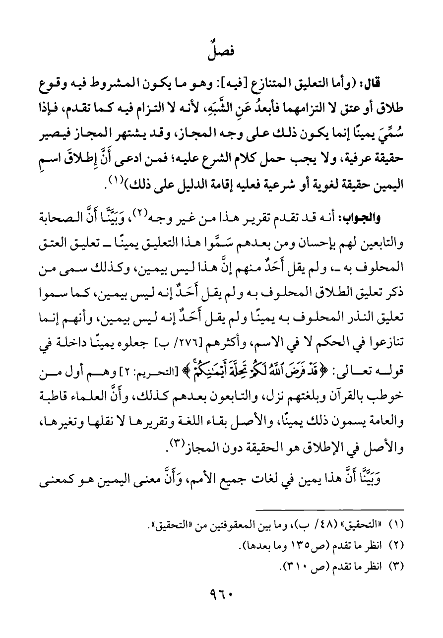 قال: (وأما التعليق المتنازع [فيه]: وهو ما يكون المشروط فيه وقوع طلاق أو عتق لا التزامهما فأبعدُ عَنِ الشَّبَهِ، لأنه لا التزام فيه كما تقدم، فإذا سُمِّيَ يمينًا إنما يكون ذلك على وجه المجاز، وقد يشتهر المجاز فيصير حقيقة عرفية، ولا يجب حمل كلام الشرع عليه؛ فمن ادعى أَنَّ إِطلاقَ اسمِ اليمين حقيقة لغوية أو شرعية فعليه إقامة الدليل على ذلك) (¬١).