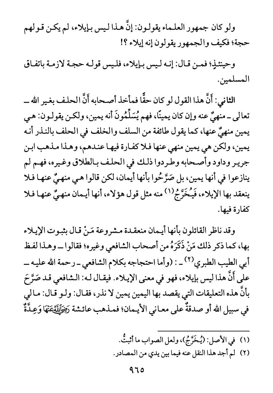 الثاني: أَنَّ هذا القول لو كان حقًّا فمأخذ أصحابه أَنَّ الحلف بغير الله ــ تعالى ــ منهيٌ عنه وإن كان يمينًا، فهم يُسَلِّمُونَ أنه يمين، ولكن يقولون: هي يمين منهيٌ عنها، كما يقول طائفة من السلف والخلف في الحلف بالنذر أنه يمين، ولكن هي يمين منهي عنها فلا كفارة فيها عندهم، وهذا مذهب ابن جرير وداود وأصحابه وطردوا ذلك في الحلف بالطلاق وغيره، فهم لم ينازعوا في أنها يمين، بل صَرَّحُوا بأنها أيمان، لكن قالوا هي منهيٌ عنها فلا ينعقد بها الإيلاء، فَيُخَرَّجُ (¬١) منه مثل قول هؤلاء، أنها أيمان منهيٌ عنها فلا كفارة فيها.