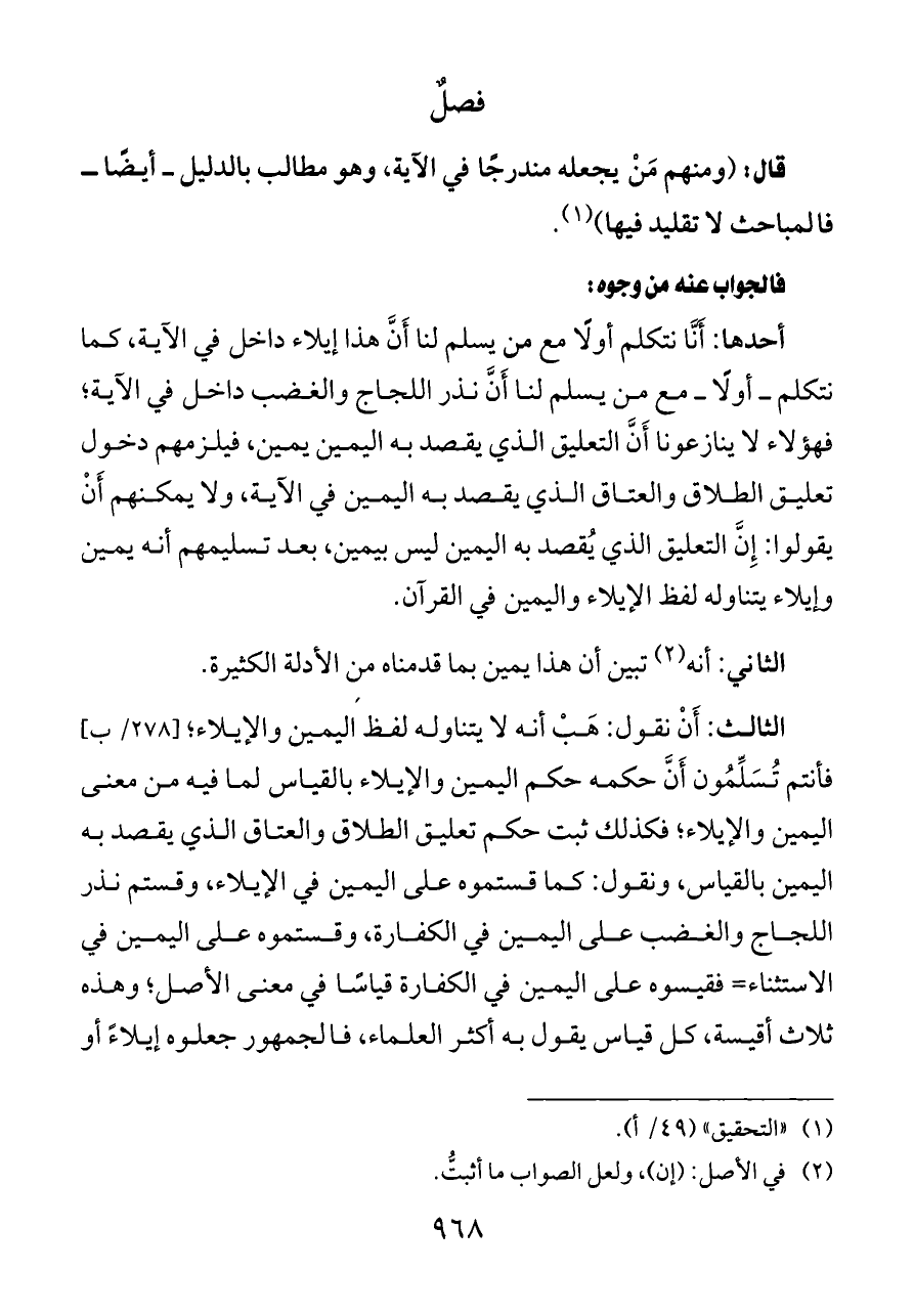 الثالث: أَنْ نقول: هَبْ أنه لا يتناوله لفظ اليمين والإيلاء؛ [٢٧٨/ ب] فأنتم تُسَلِّمُون أَنَّ حكمه حكم اليمين والإيلاء بالقياس لما فيه من معنى اليمين والإيلاء؛ فكذلك ثبت حكم تعليق الطلاق والعتاق الذي يقصد به اليمين بالقياس، ونقول: كما قستموه على اليمين في الإيلاء، وقستم نذر اللجاج والغضب على اليمين في الكفارة، وقستموه على اليمين في الاستثناء= فقيسوه على اليمين في الكفارة قياسًا في معنى الأصل؛ وهذه ثلاث أقيسة، كل قياس يقول به أكثر العلماء، فالجمهور جعلوه إيلاءً أو