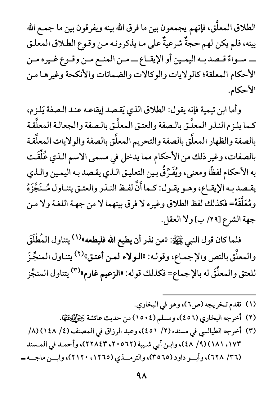 وأما ابن تيمية فإنه يقول: الطلاق الذي يَقصد إيقاعه عند الصفة يَلزم، كما يلزم النذر المعلَّق بالصفة والعتق المعلَّق بالصفة والجعالة المعلَّقة بالصفة والظهار المعلَّق بالصفة والتحريم المعلَّق بالصفة والولايات المعلَّقة بالصفات، وغير ذلك من الأحكام مما يدخل في مسمى الاسم الذي عُلِّقَت به الأحكام لفظًا ومعنى، ويُفَرِّقُ بين التعليق الذي يقصد به اليمين والذي يقصد به الإيقاع، وهو يقول: كما أَنَّ لفظ النذر والعتق يتناول مُنَجَّزَهُ ومُعَلَّقَهُ= فكذلك لفظ الطلاق وغيره لا فرق بينهما لا من جهة اللغة ولا من جهة الشرع [٢٩/ ب] ولا العقل.