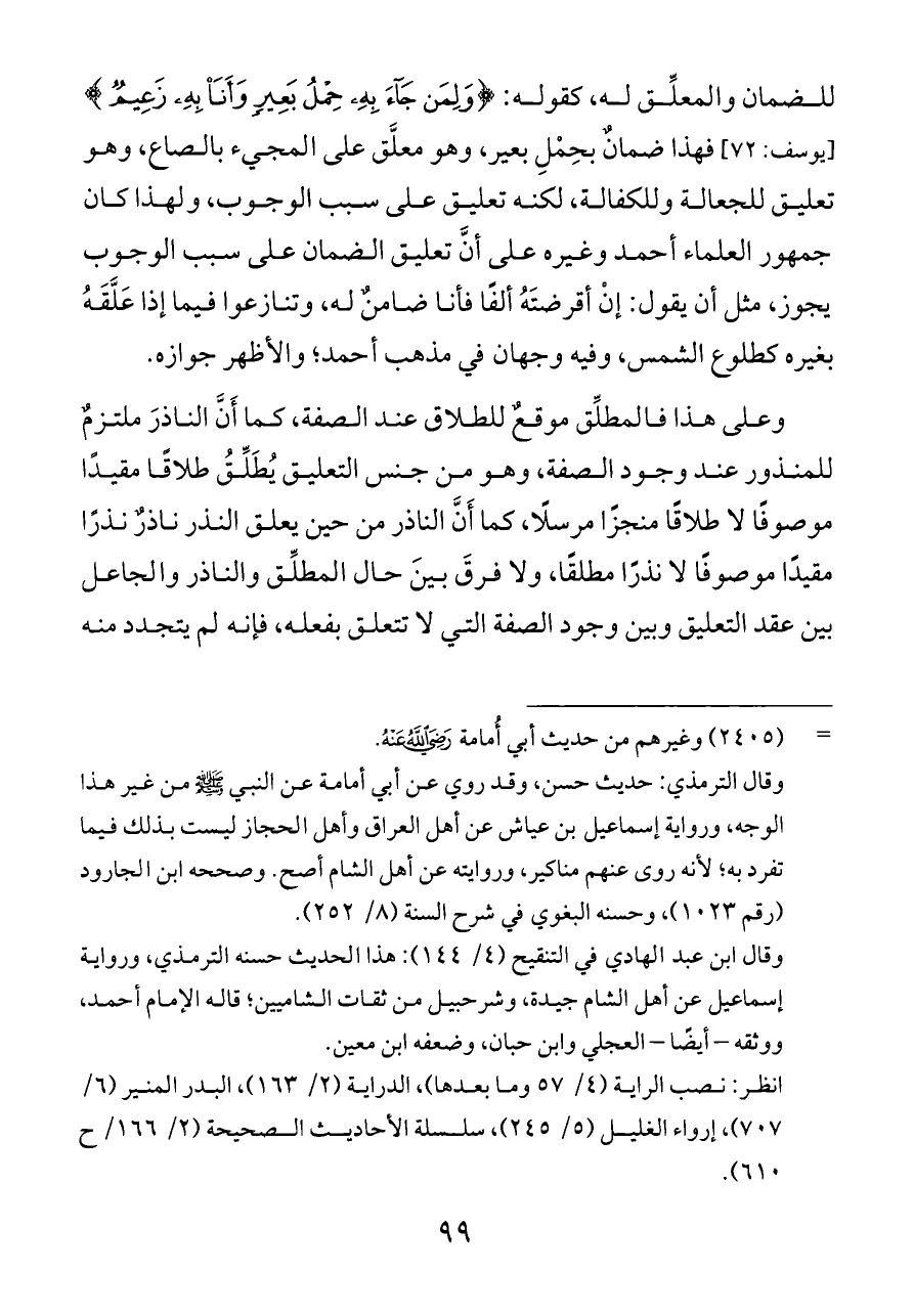 للضمان والمعلِّق له، كقوله: {وَلِمَنْ جَاءَ بِهِ حِمْلُ بَعِيرٍ وَأَنَا بِهِ زَعِيمٌ} [يوسف: ٧٢] فهذا ضمانٌ بحِمْلِ بعير، وهو معلَّق على المجيء بالصاع، وهو تعليق للجعالة وللكفالة، لكنه تعليق على سبب الوجوب، ولهذا كان جمهور العلماء أحمد وغيره على أنَّ تعليق الضمان على سبب الوجوب يجوز، مثل أن يقول: إنْ أقرضتَهُ ألفًا فأنا ضامنٌ له، وتنازعوا فيما إذا عَلَّقَهُ بغيره كطلوع الشمس، وفيه وجهان في مذهب أحمد؛ والأظهر جوازه.