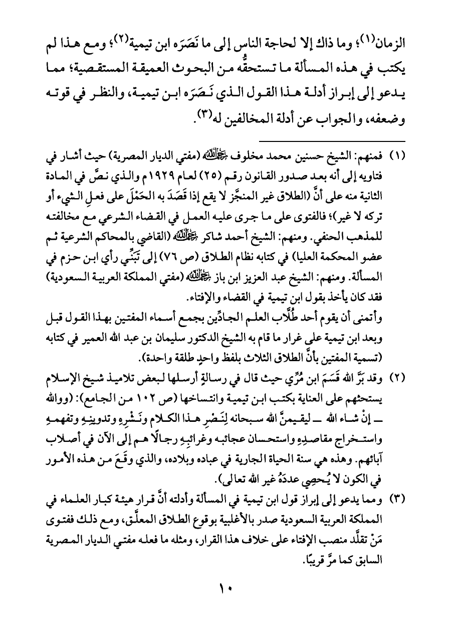 وما ذاك إلا لحاجة الناس إلى ما نَصَرَه ابن تيمية (¬٢)؛ ومع هذا لم يكتب في هذه المسألة ما تستحقُّه من البحوث العميقة المستقصية؛ مما يدعو إلى إبراز أدلة هذا القول الذي نَصَرَه ابن تيمية، والنظر في قوته وضعفه، والجواب عن أدلة المخالفين له (¬٣).