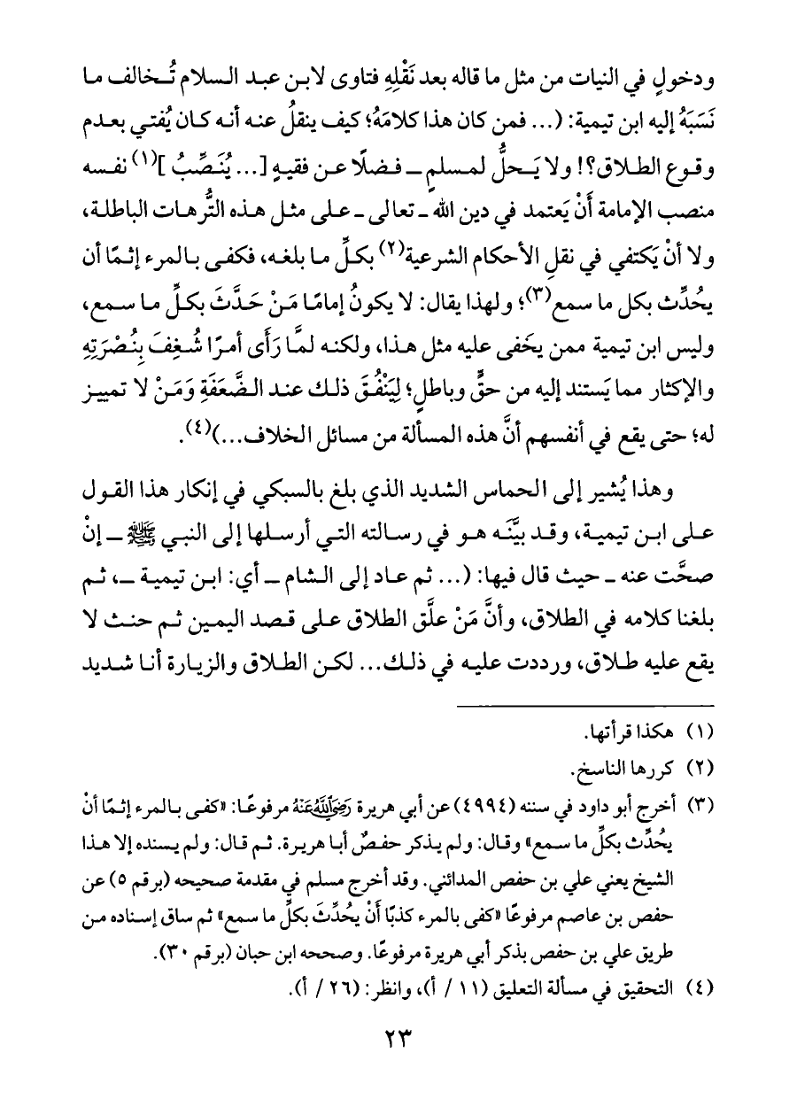ودخولٍ في النيات من مثل ما قاله بعد نَقْلِهِ فتاوى لابن عبد السلام تُخالف ما نَسَبَهُ إليه ابن تيمية: ( ... فمن كان هذا كلامَهُ؛ كيف ينقلُ عنه أنه كان يُفتي بعدم وقوع الطلاق؟! ولا يَحلُّ لمسلمٍ ــ فضلًا عن فقيهٍ [ ... يُنَصِّبُ] (¬١) نفسه منصب الإمامة أَنْ يَعتمد في دين الله ــ تعالى ــ على مثل هذه التُّرهات الباطلة، ولا أنْ يَكتفي في نقلِ الأحكام الشرعية (¬٢) بكلِّ ما بلغه، فكفى بالمرء إثمًا أن يُحدِّث بكل ما سمع (¬٣)؛ ولهذا يقال: لا يكونُ إمامًا مَنْ حَدَّثَ بكلِّ ما سمع، وليس ابن تيمية ممن يَخفى عليه مثل هذا، ولكنه لَمَّا رَأَى أمرًا شُغِفَ بِنُصْرَتِهِ والإكثار مما يَستند إليه من حقٍّ وباطلٍ؛ لِيَنْفُقَ ذلك عند الضَّعَفَةِ وَمَنْ لا تمييز له؛ حتى يقع في أنفسهم أنَّ هذه المسألة من مسائل الخلاف ... ) (¬٤).