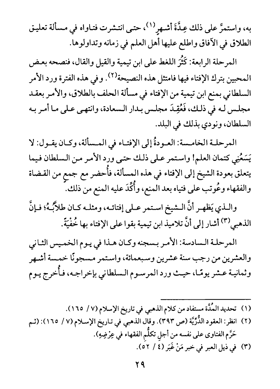 (¬٢) انظر: العقود الدُّرِّيَّة (ص ٣٩٣). وقال الذهبي في تاريخ الإسلام (٧/ ١٦٥): (ثم حَرَّم الفتاوى على نفسه من أجلِ تكلُّمِ الفقهاء في عِرْضِهِ).