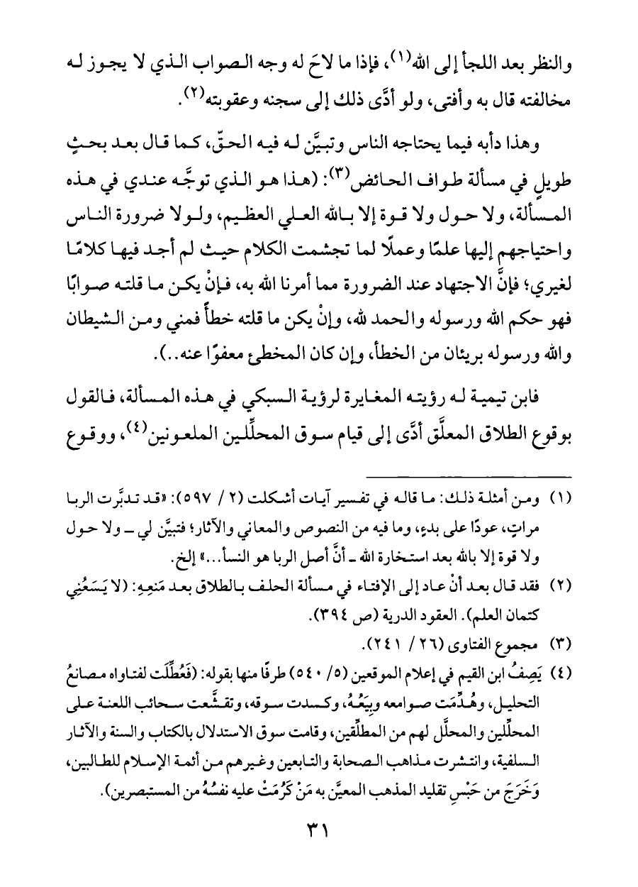 وهذا دأبه فيما يحتاجه الناس وتبيَّن له فيه الحقّ، كما قال بعد بحثٍ طويلٍ في مسألة طواف الحائض (¬٣): (هذا هو الذي توجَّه عندي في هذه المسألة، ولا حول ولا قوة إلا بالله العلي العظيم، ولولا ضرورة الناس واحتياجهم إليها علمًا وعملًا لما تجشمت الكلام حيث لم أجد فيها كلامًا لغيري؛ فإنَّ الاجتهاد عند الضرورة مما أمرنا الله به، فإنْ يكن ما قلته صوابًا فهو حكم الله ورسوله والحمد لله، وإنْ يكن ما قلته خطأً فمني ومن الشيطان والله ورسوله بريئان من الخطأ، وإن كان المخطئ معفوًا عنه .. ).