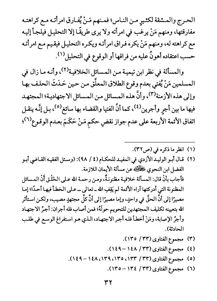 وأنه ما زال في المسلمين مَنْ يُفتي بعدم وقوع الطلاق المعلَّق من حين حَدَثَ الحلف بها وإلى هذه الأزمنة (¬٣)، وأنَّ هذه المسائل من المسائل الاجتهادية؛ المجتهد فيها ما بين أجرٍ وأجرين (¬٤)، كما أنَّ الفتيا والقضاء بها سائغ (¬٥)، بل إنَّه ينقل اتفاق الأئمة الأربعة على عدم جواز نقضِ حكمِ مَنْ حَكَمَ بعدم الوقوع (¬٦)؛