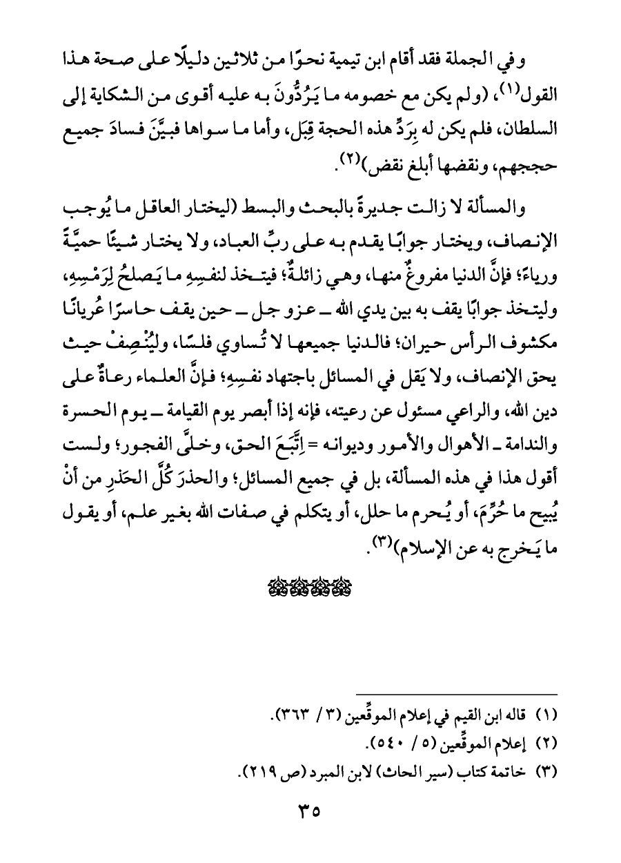 والمسألة لا زالت جديرةً بالبحث والبسط (ليختار العاقل ما يُوجب الإنصاف، ويختار جوابًا يقدم به على ربِّ العباد، ولا يختار شيئًا حميَّةً ورياءً؛ فإنَّ الدنيا مفروغٌ منها، وهي زائلةٌ؛ فيتخذ لنفسِهِ ما يَصلحُ لِرَمْسِهِ، وليتخذ جوابًا يقف به بين يدي الله ــ عزو جل ــ حين يقف حاسرًا عُريانًا مكشوف الرأس حيران؛ فالدنيا جميعها لا تُساوي فلسًا، وليُنْصِفْ حيث يحق الإنصاف، ولا يَقل في المسائل باجتهاد نفسِهِ؛ فإنَّ العلماء رعاةٌ على دين الله، والراعي مسئول عن رعيته، فإنه إذا أبصر يوم القيامة ــ يوم الحسرة والندامة ــ الأهوال والأمور وديوانه = اِتَّبَعَ الحق، وخلَّى الفجور؛ ولست أقول هذا في هذه المسألة، بل في جميع المسائل؛ والحذرَ كُلَّ الحَذرِ من أنْ يُبيح ما حُرِّمَ، أو يُحرم ما حلل، أو يتكلم في صفات الله بغير علم، أو يقول ما يَخرج به عن الإسلام) (¬٣).