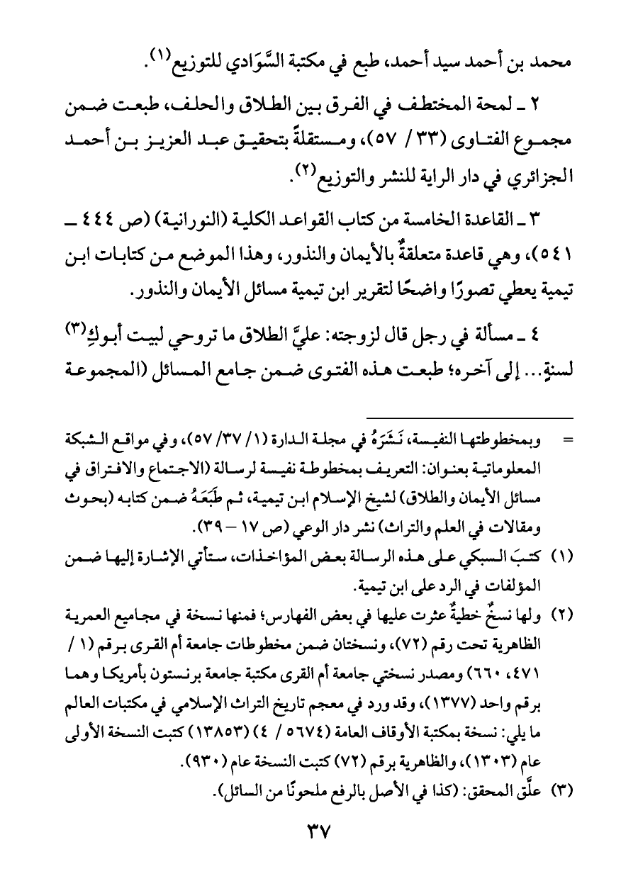 ٤ ــ مسألة في رجل قال لزوجته: عليَّ الطلاق ما تروحي لبيت أبوكِ (¬٣) لسنةٍ ... إلى آخره؛ طبعت هذه الفتوى ضمن جامع المسائل (المجموعة