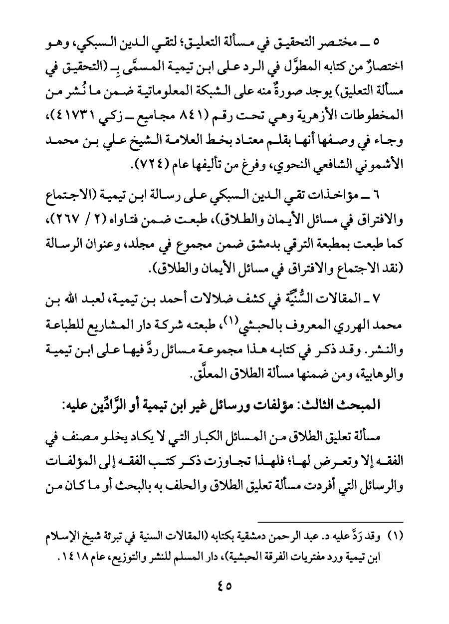 ٧ ــ المقالات السُّنِّيَّة في كشف ضلالات أحمد بن تيمية، لعبد الله بن محمد الهرري المعروف بالحبشي (¬١)، طبعته شركة دار المشاريع للطباعة والنشر. وقد ذكر في كتابه هذا مجموعة مسائل ردَّ فيها على ابن تيمية والوهابية، ومن ضمنها مسألة الطلاق المعلَّق.