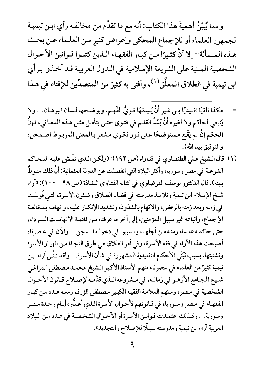(¬١) قال الشيخ علي الطنطاوي في فتاواه (ص ١٩٢): (ولكن الذي تَمشي عليه المحاكم الشرعية في مصر وسوريا، وأكثر البلاد التي انفصلت عن الدولة العثمانية: أنَّ ذلك منوطٌ بنيته). قال الدكتور يوسف القرضاوي في كتابه الفتاوى الشاذة (ص ٩٨ - ١٠٠): «آراء شيخ الإسلام ابن تيمية وتلاميذ مدرسته في قضايا الطلاق وشئون الأسرة، التي قُوبلت في زمنه وبعد زمنه بالرفض، والاتهام بالشذوذ، وتشديد الإنكار عليه، واتهامه بمخالفة الإجماع، واتباعه غير سبيل المؤمنين، إلى آخر ما عرفناه من قائمة الاتهامات السوداء، حتى حاكمه علماء زمنه من أجلها، وتسببوا في دخوله السجن ... والآن في عصرنا؛ أصبحت هذه الآراء في فقه الأسرة، وفي أمر الطلاق هي طوق النجاة من انهيار الأسرة وتشتيتها، بسبب تَبَنِّي الأحكام التقليدية المشهورة في شأن الأسرة ... ولقد تبنَّى آراء ابن تيمية كثيرٌ من العلماء في عصرنا، منهم الأستاذ الأكبر الشيخ محمد مصطفى المراغي شيخ الجامع الأزهر في زمانه، في مشروعه الذي قدَّمه لإصلاح قانون الأحوال الشخصية في مصر، ومنهم العلامة الفقيه الكبير مصطفى الزرقا ومعه عدد من كبار الفقهاء في مصر وسوريا، في قانونهم لأحوال الأسرة الذي أعدُّوه أيام وحدة مصر وسورية ... وكذلك اعتمدت قوانين الأسرة أو الأحوال الشخصية في عدد من البلاد العربية آراء ابن تيمية ومدرسته سبيلًا للإصلاح والتجديد» ..