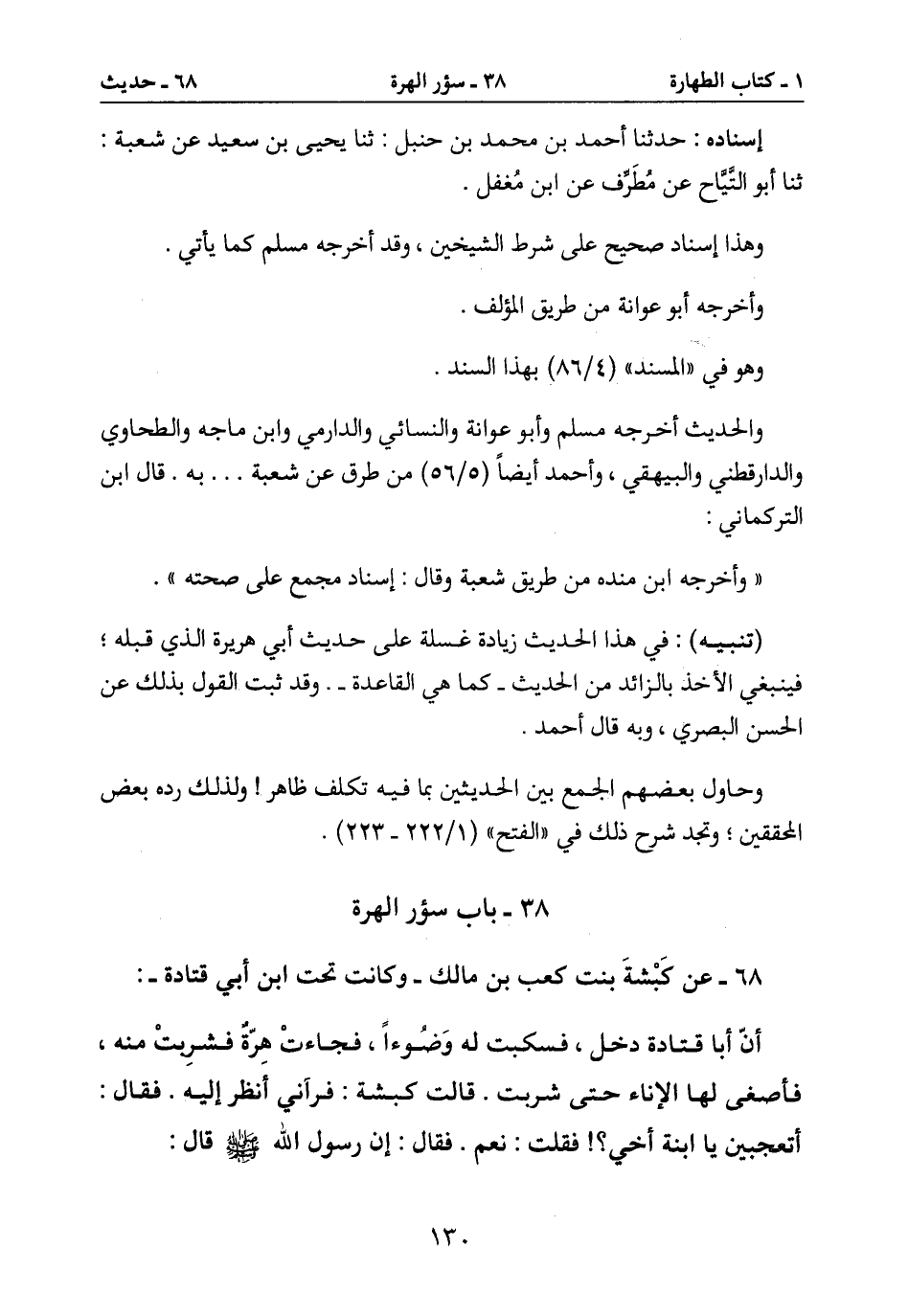 أنّ أبا قتادة دخل، فسكبت له وَضُوءاً، فجاءتْ هِرّةٌ فشرِبتْ منه،