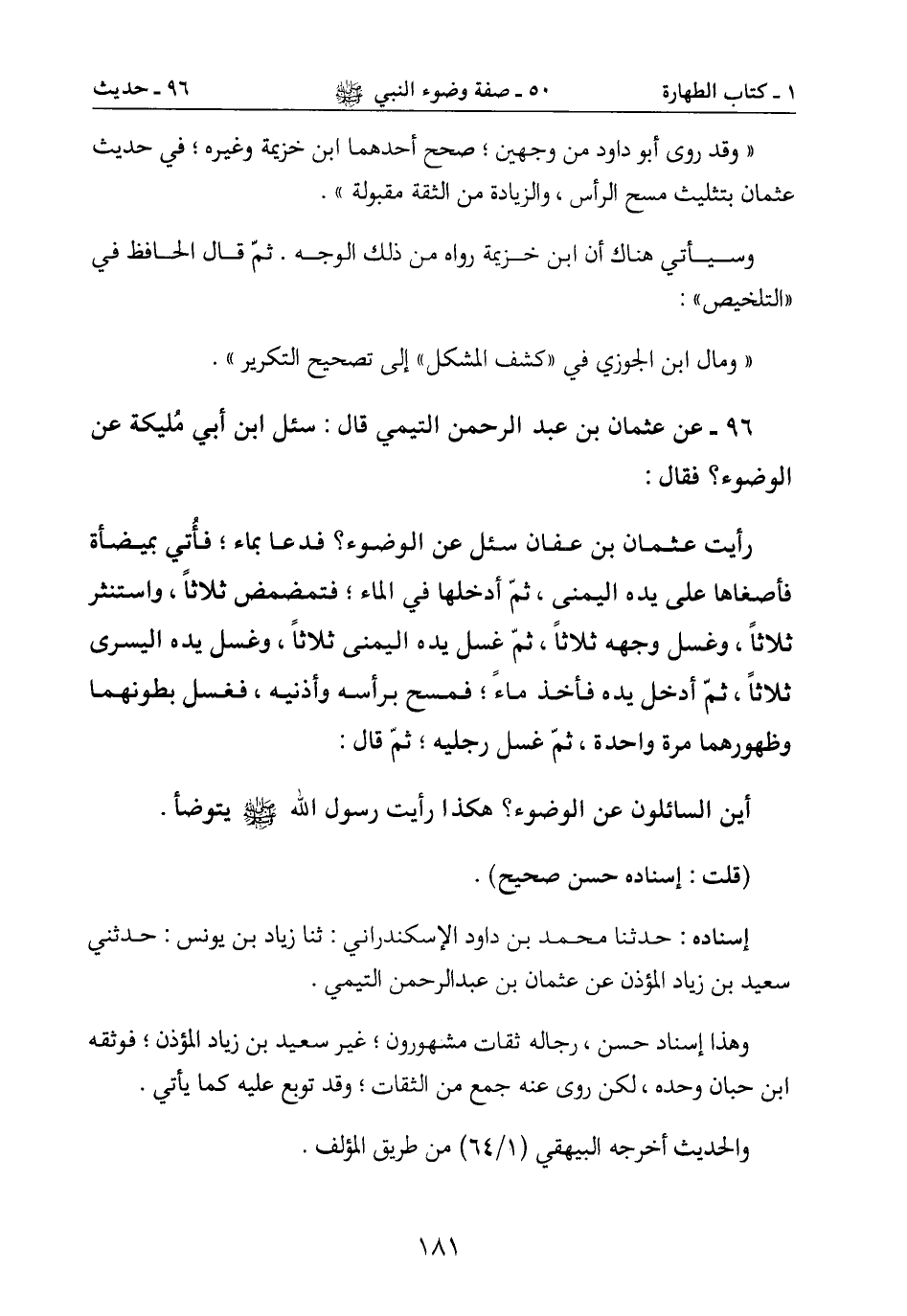 عثمان بتثليث مسح الرأس، والزيادة من الثقة مقبولة ".