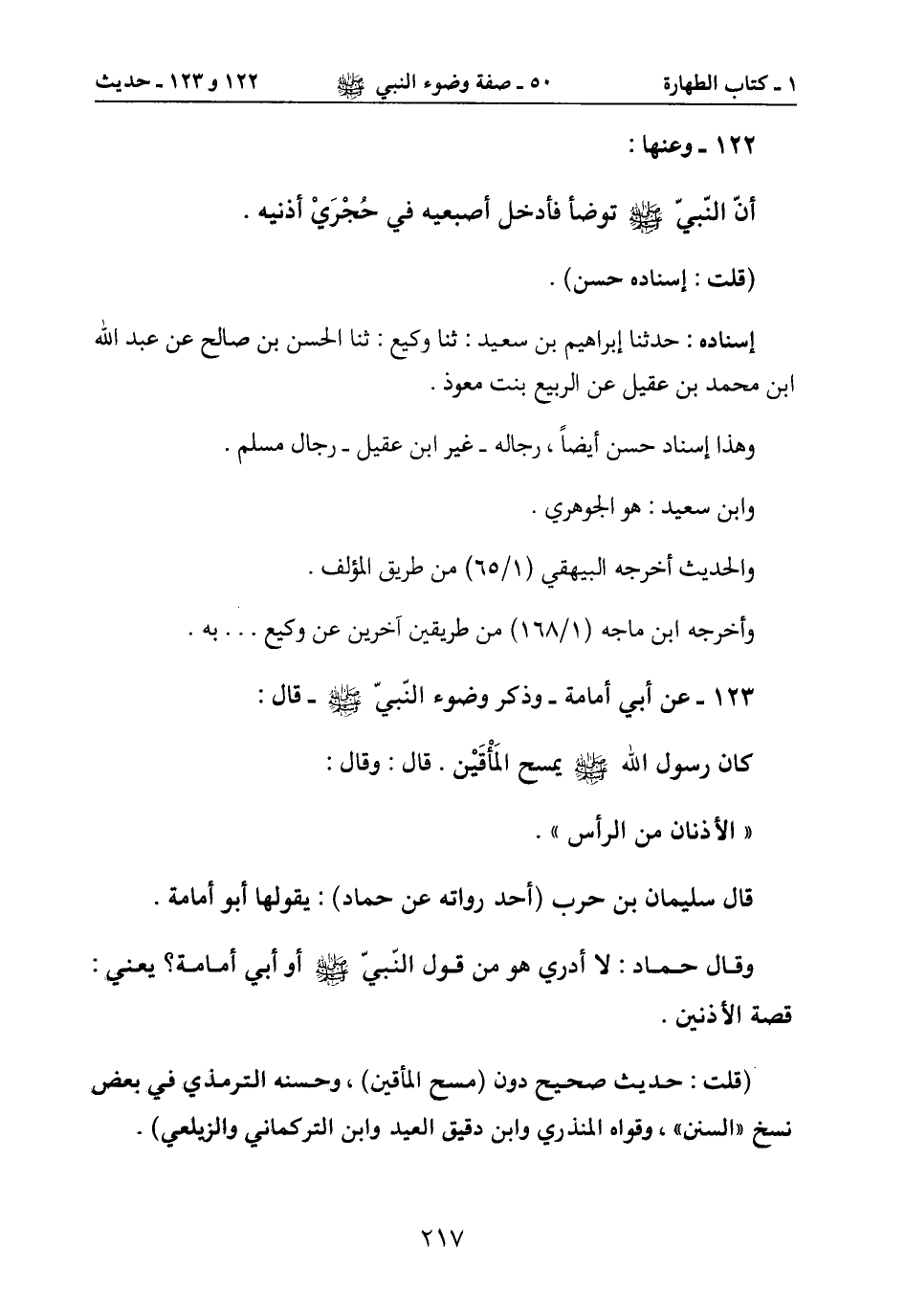 123- عن أبي أمامة- وذكر وضوء النّبيّ صَلَّى اللَّهُ عَلَيْهِ وَسَلَّمَ- قال: