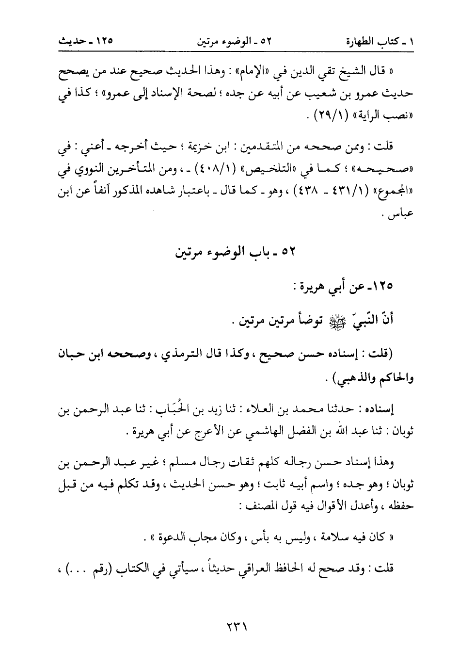 أنّ النّبيّ صَلَّى اللَّهُ عَلَيْهِ وَسَلَّمَ توضأ مرتين مرتين.