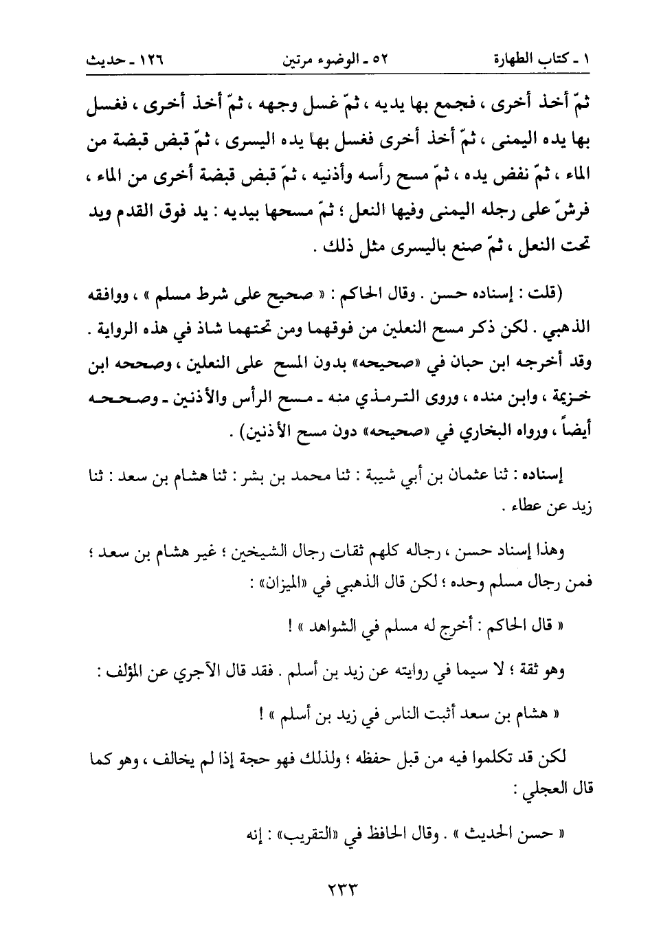 وقد أخرجه ابن حبان في "صحيحه " بدون المسح على النعلين، وصححه ابن