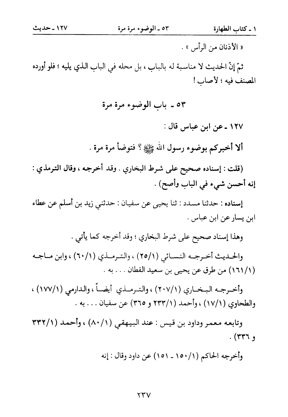 ألا أخبركم بوضوء رسول الله صَلَّى اللَّهُ عَلَيْهِ وَسَلَّمَ؟ فتوضأ مرة مرة.
