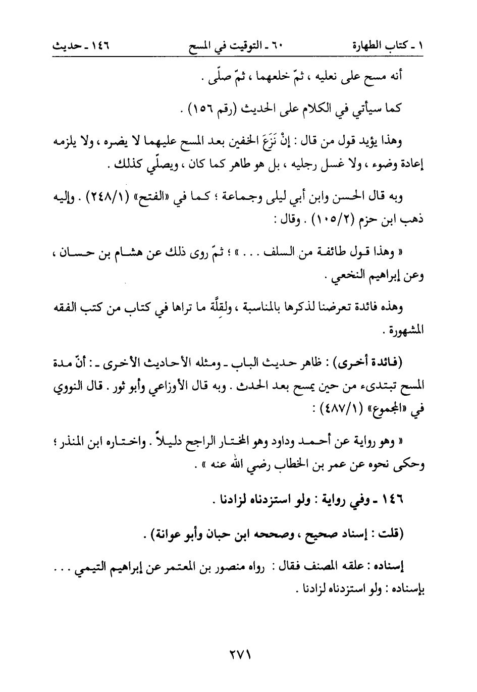 وهذا يؤيد قول من قال: إنْ نَرع الخفين بعد المسح عليهما لا يضره، ولا يلزمه