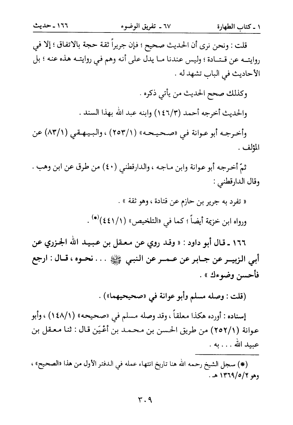 قلت: ونحن نرى أن الحديث صحيح؛ فإن جريراً ثقة حجة بالاتفاق؛ إلا في