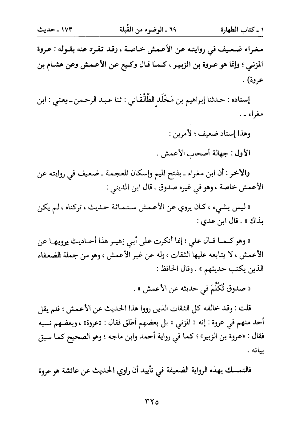 مغراء ضعيف في روايته عن الأعمش خاصة، وقد تفرد عنه بقوله: عروة