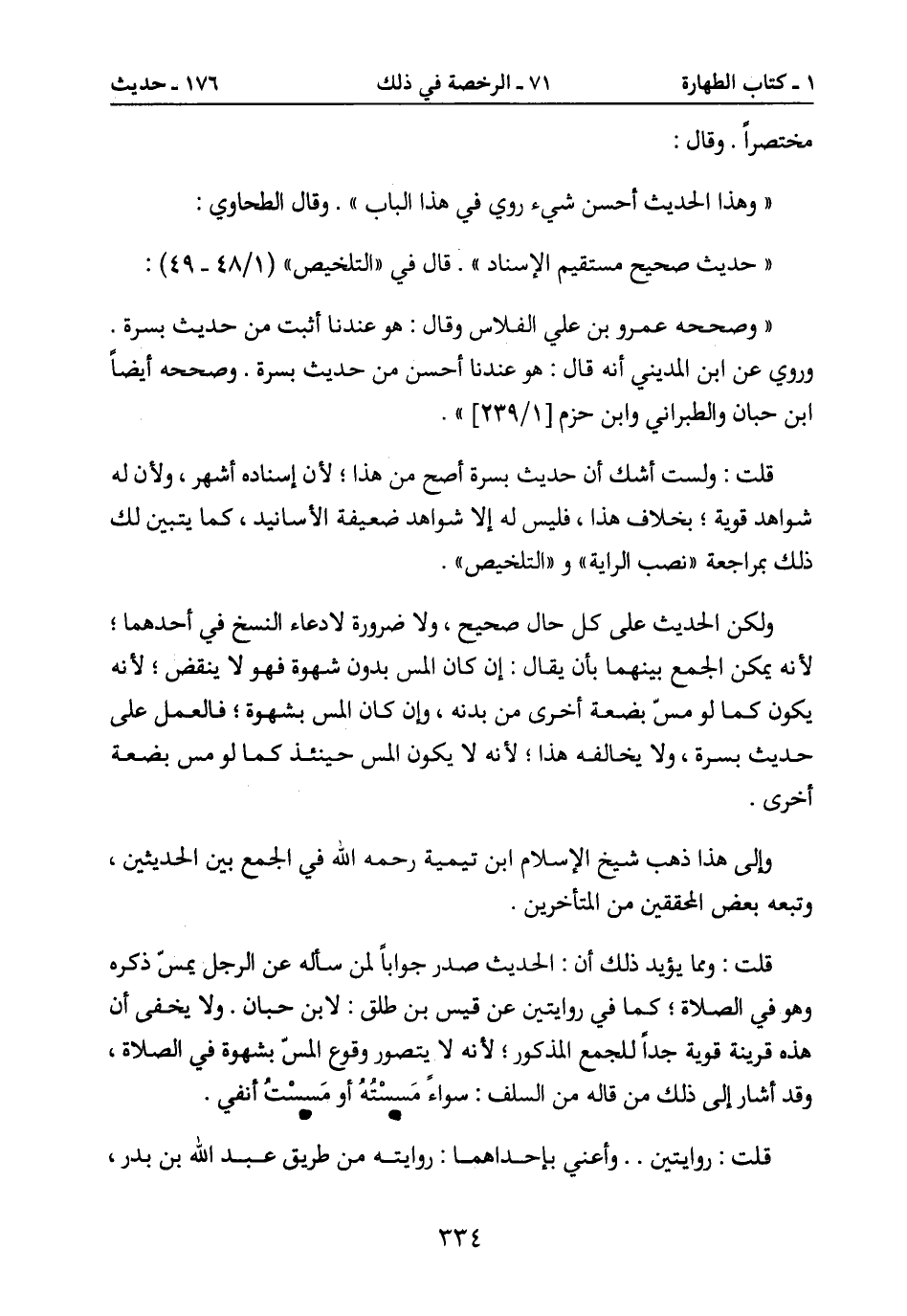 قلت: ولست أشك أن حديث بسرة أصح من هذا؛ لأن إسناده أشهر، ولأن له
