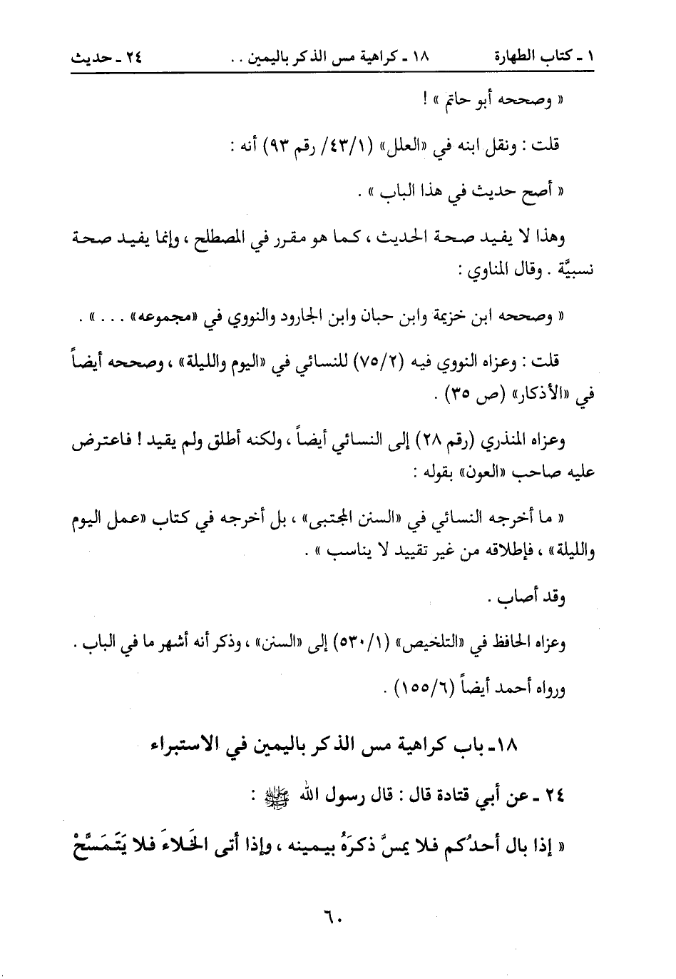 " إذا بال احدُكم فلا يمسَّ ذكرَهُ بيمينه، وإذا أتى الخَلاءَ فلا يَتمسحْ